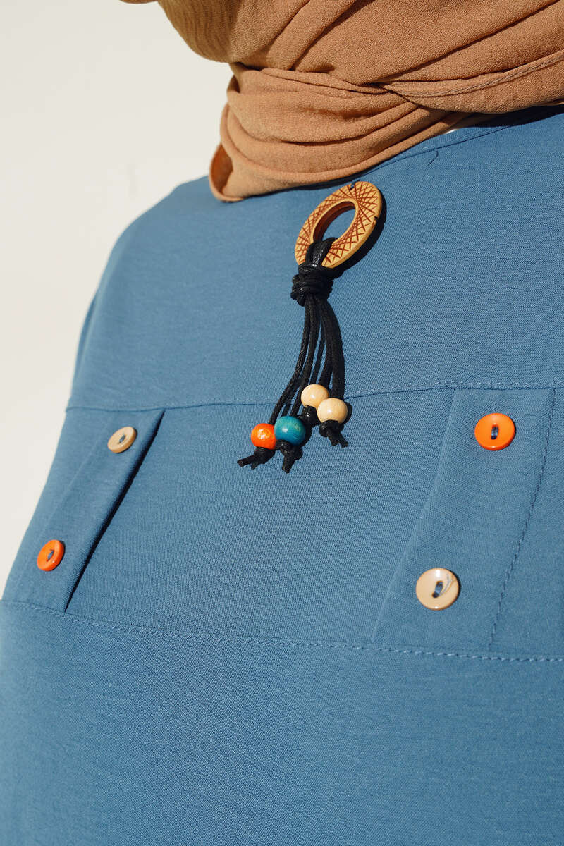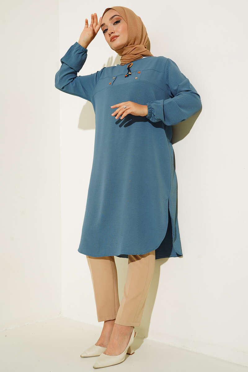 Yeni sezon tuniğimiz salaş kesimlidir. Etek uçları yırtmaç detaylı olan tuniğmizin bilkeleri lastiklidir. Ense düğmesi vardır. Göğsünde bulunan mini düğmeleri tuniğimize detay kazandırmıştır. Yakası süslemelidir.