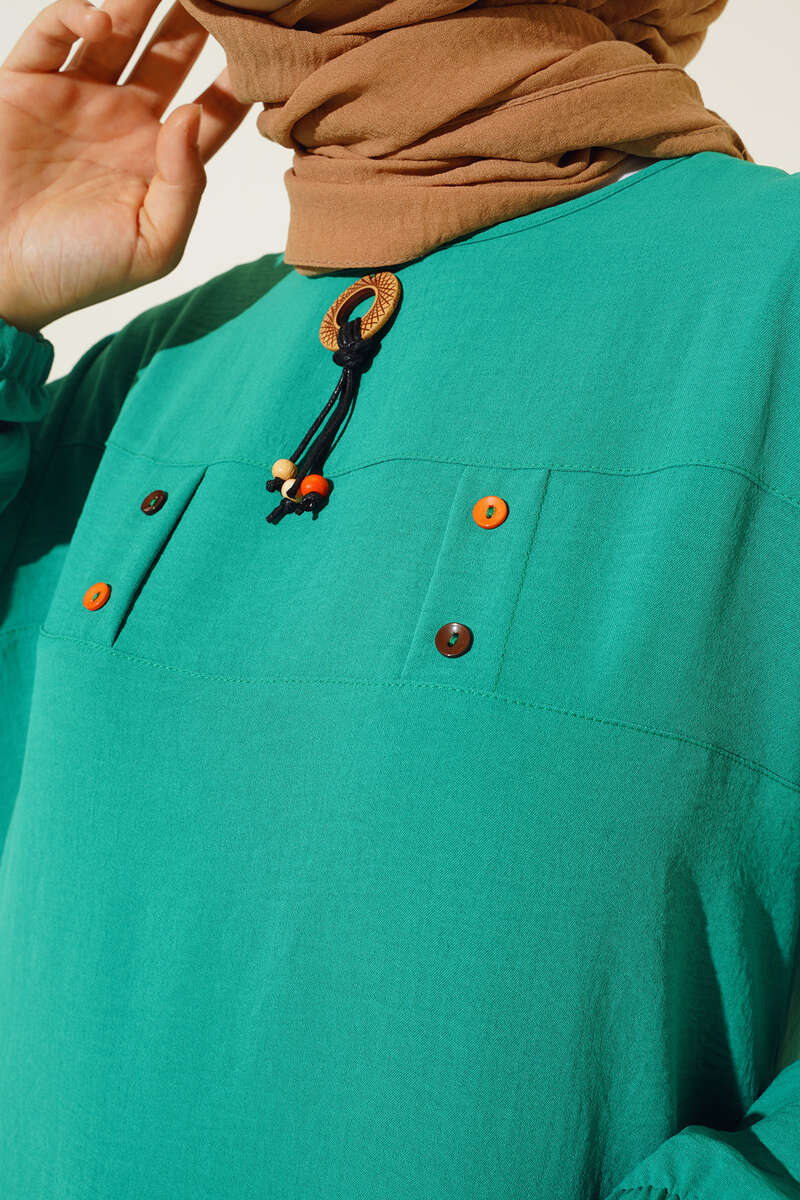 Yeni sezon tuniğimiz salaş kesimlidir. Etek uçları yırtmaç detaylı olan tuniğmizin bilkeleri lastiklidir. Ense düğmesi vardır. Göğsünde bulunan mini düğmeleri tuniğimize detay kazandırmıştır. Yakası süslemelidir.