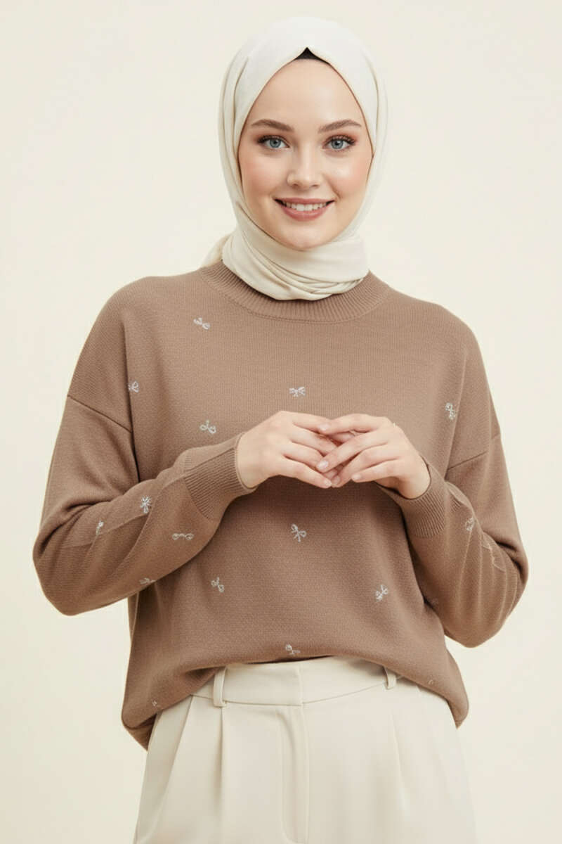 Gömlek Yaka Fularlı Triko Tunik Kahve