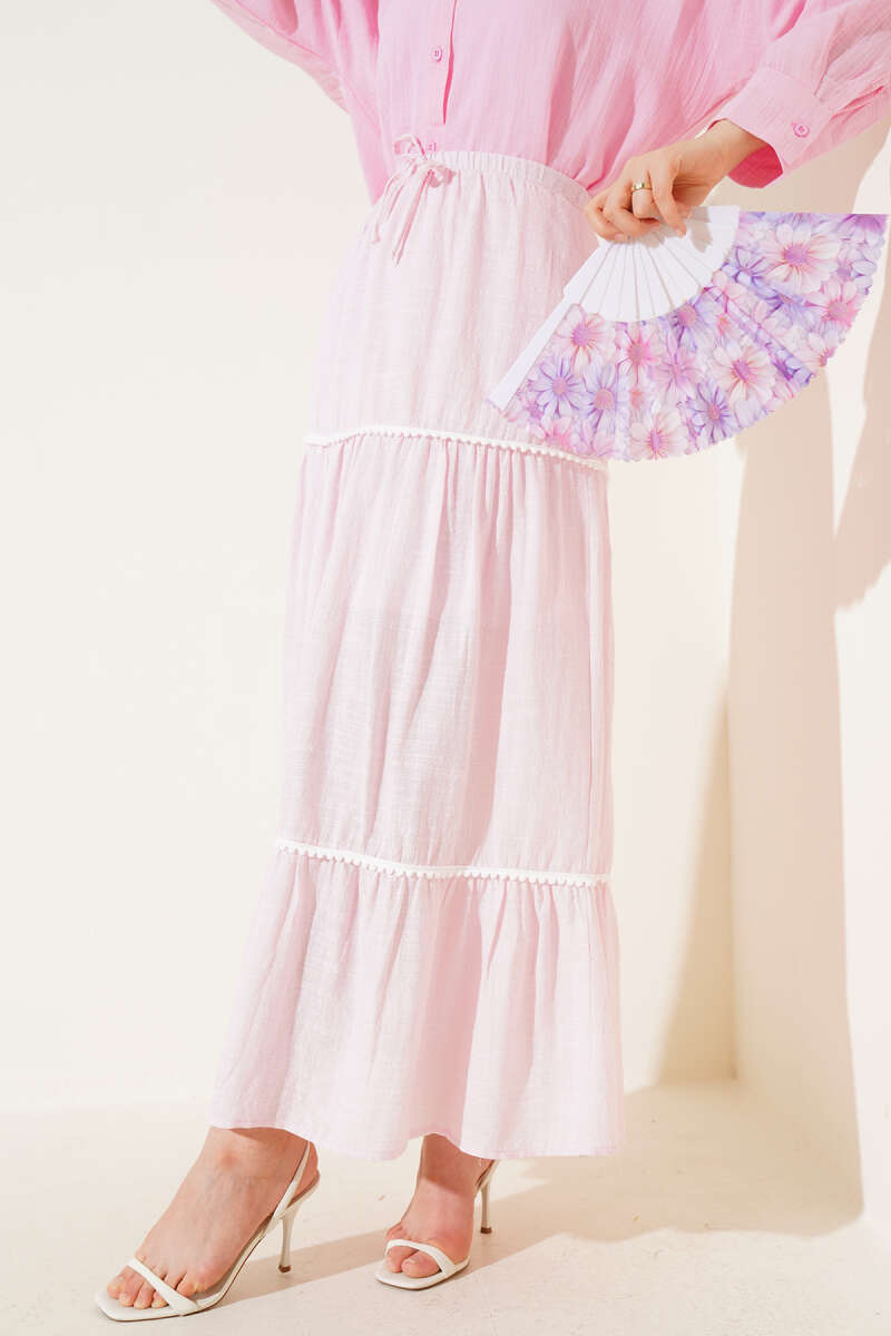Beli Lastikli Ekose Desen Kloş Etek Bej