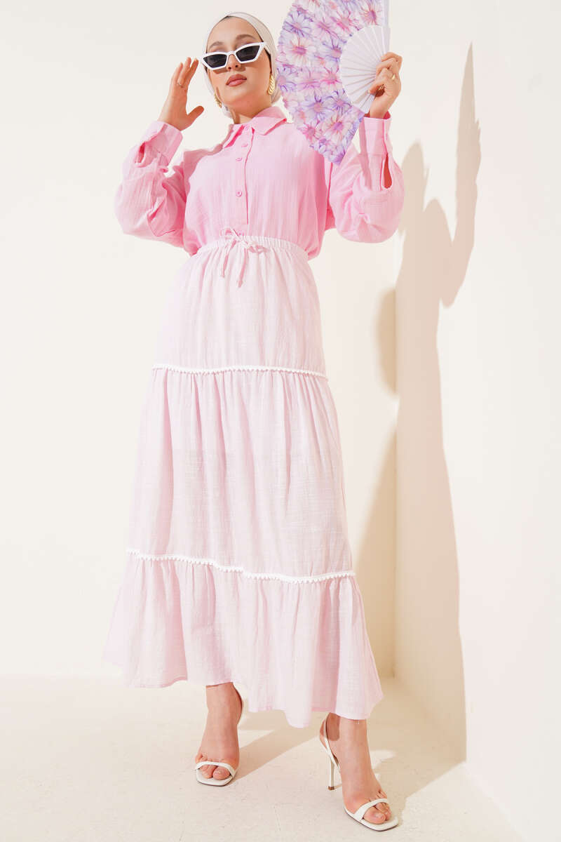 Bel Tünelli Düğmeli Ağaç Kabuğu Elbise Çağla Yeşili