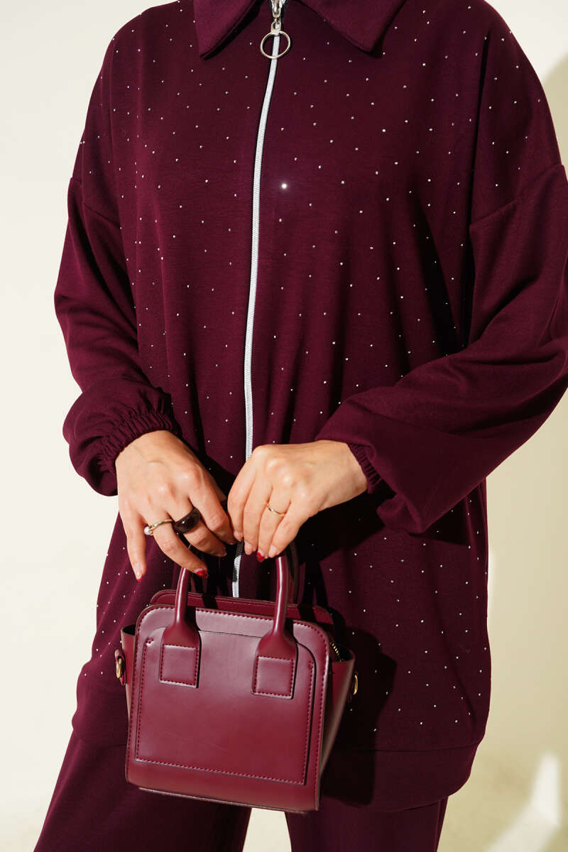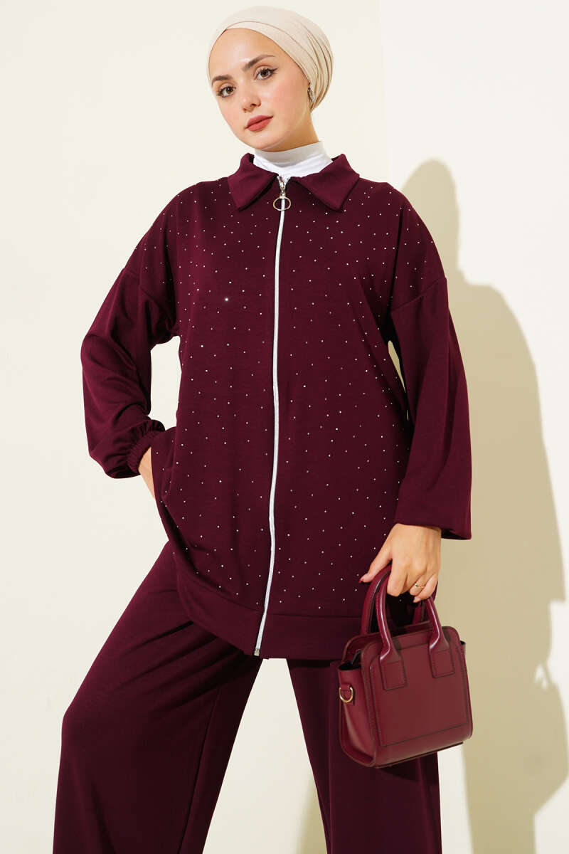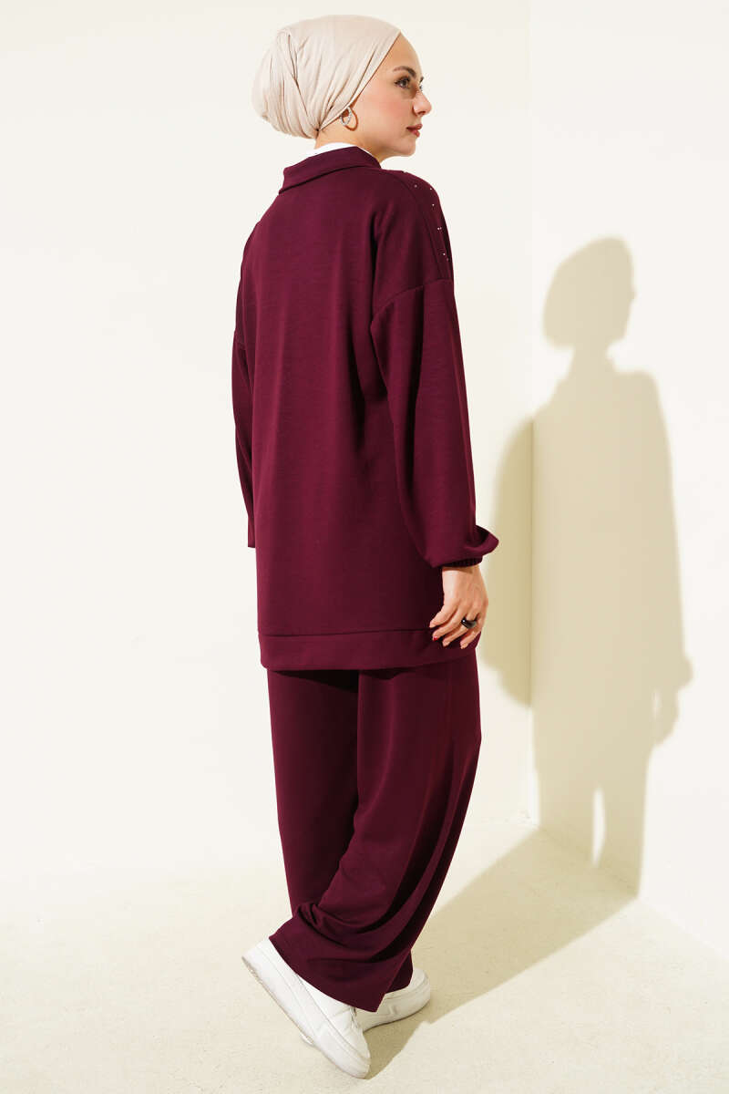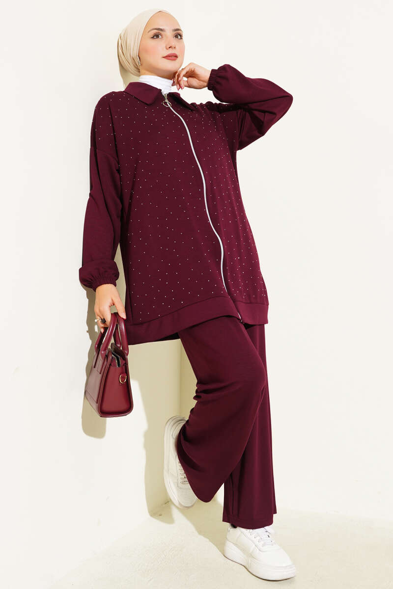 Önü Pileli Kemerli Scuba İkili Takım Bordo
