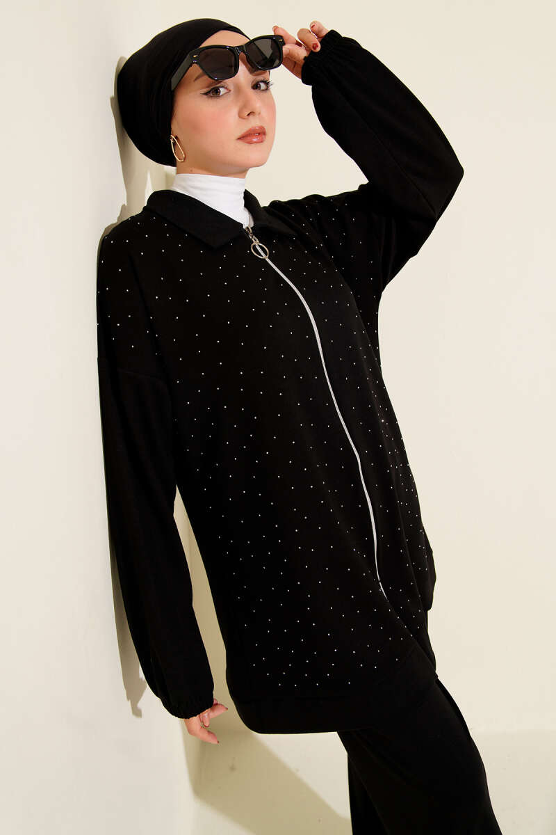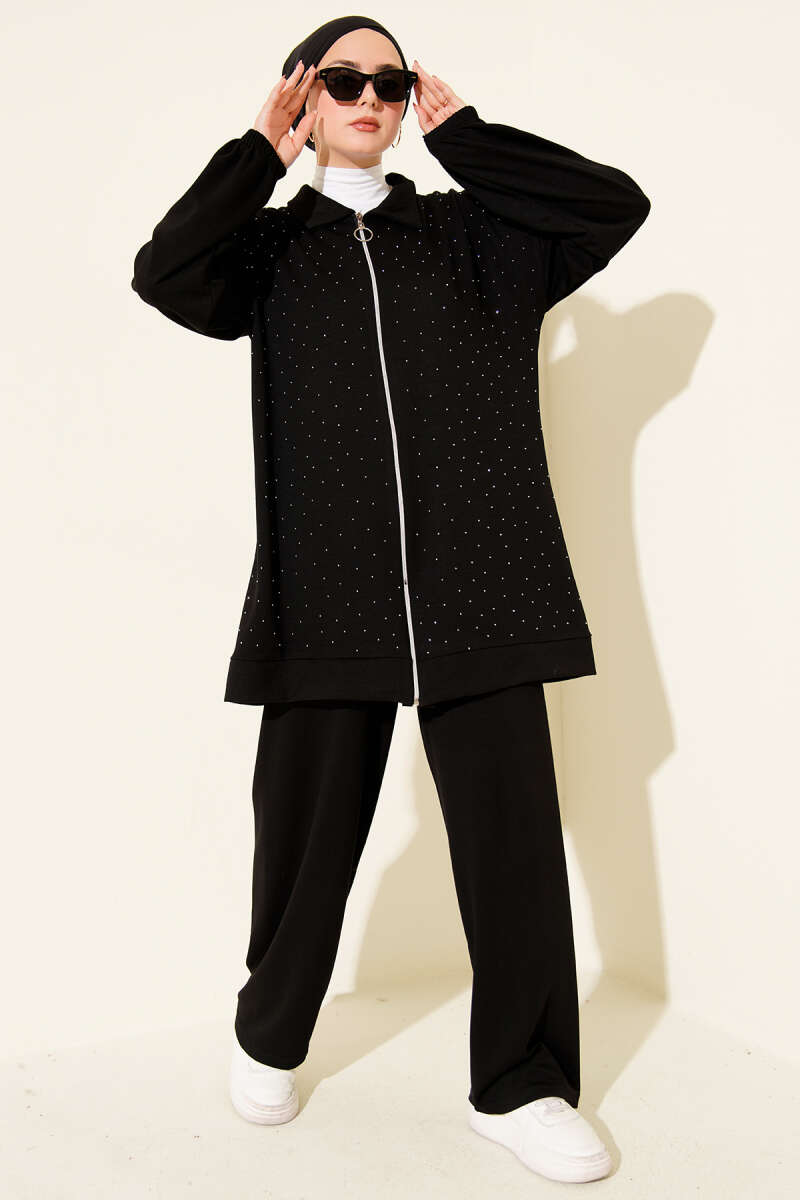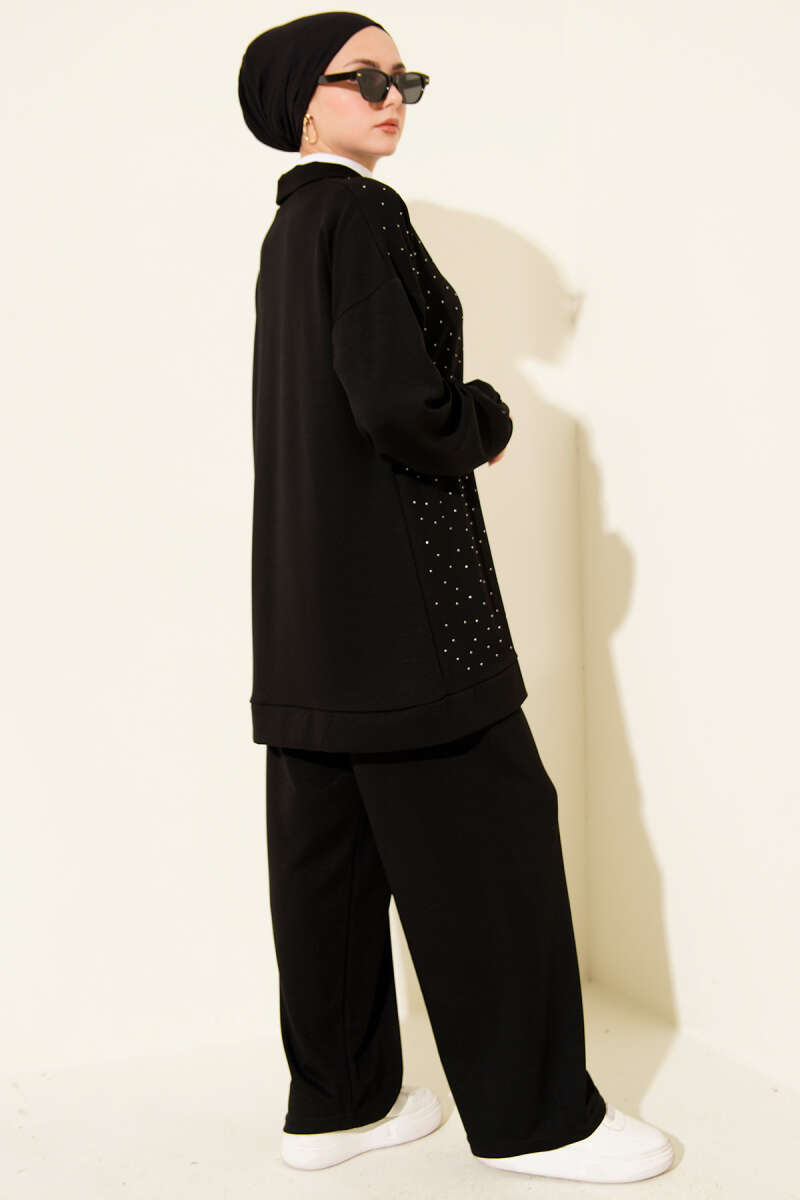 Kabartma Şeritli Taşlı Triko İkili Takım Siyah