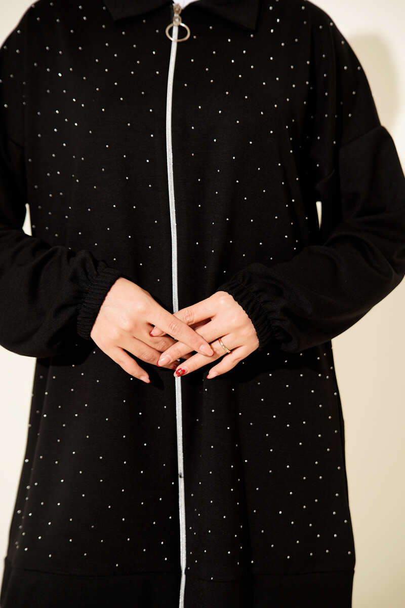 Taşlı Tül Pelerinli Abaya Siyah