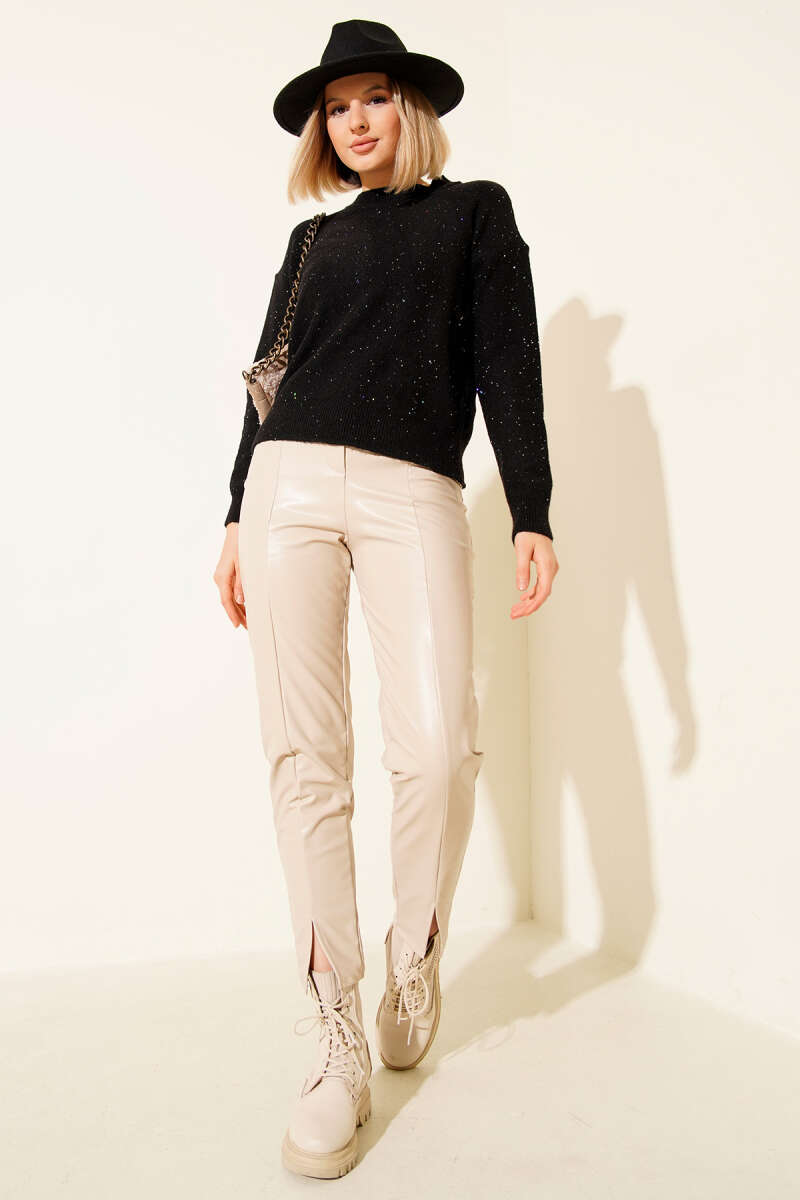 Sahte Cep Detaylı Deri Pantolon Taba