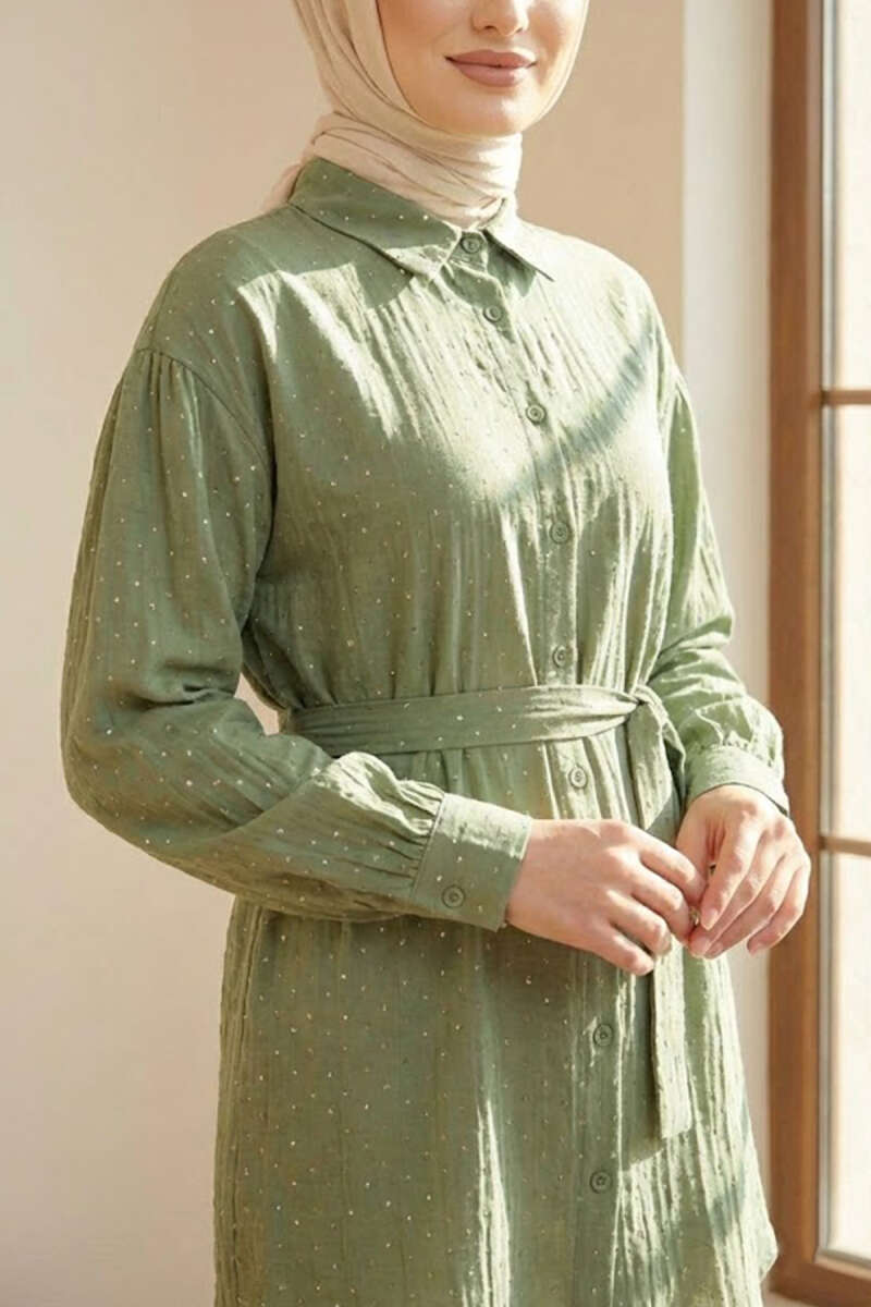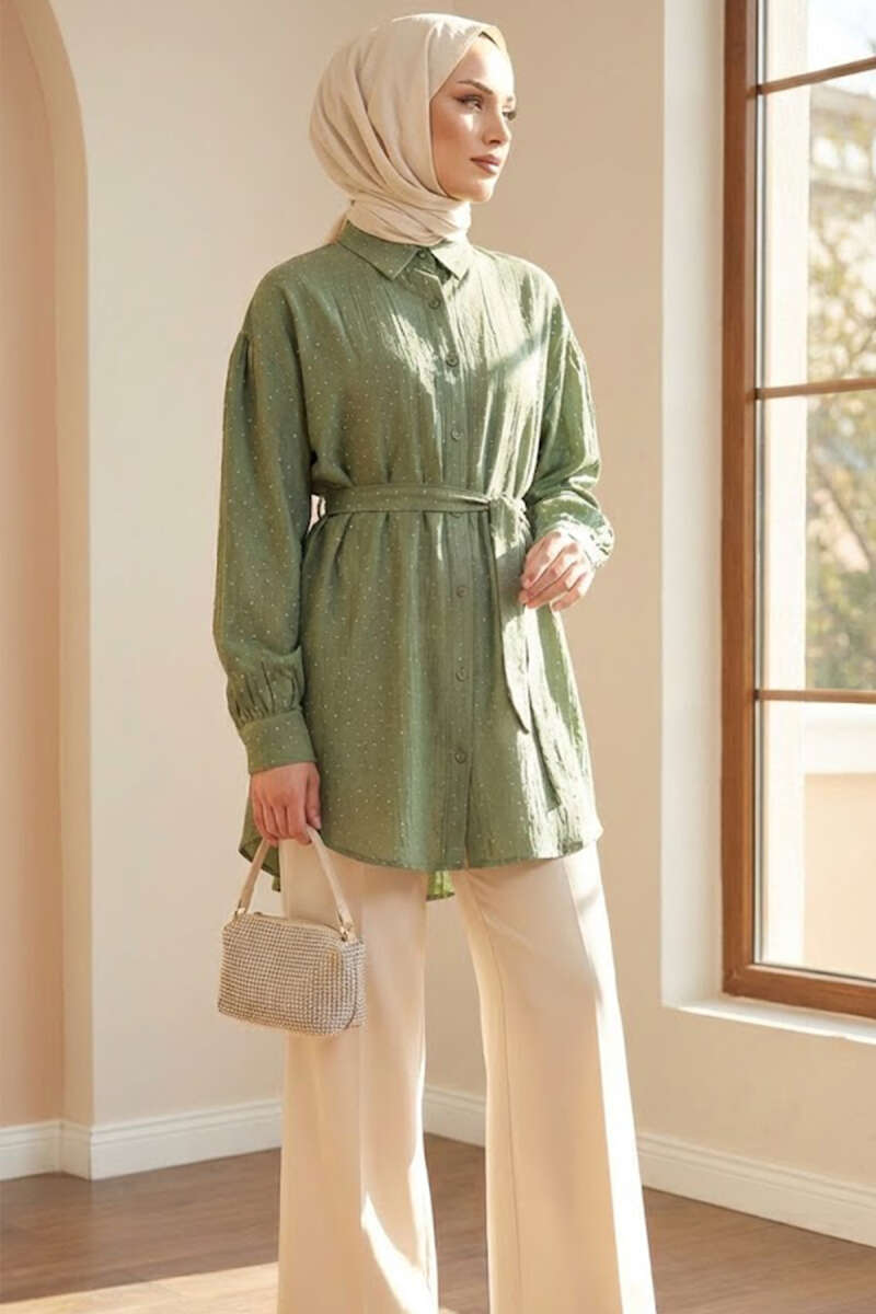 Mini Taş Detaylı Kuşaklı Gömlek Haki