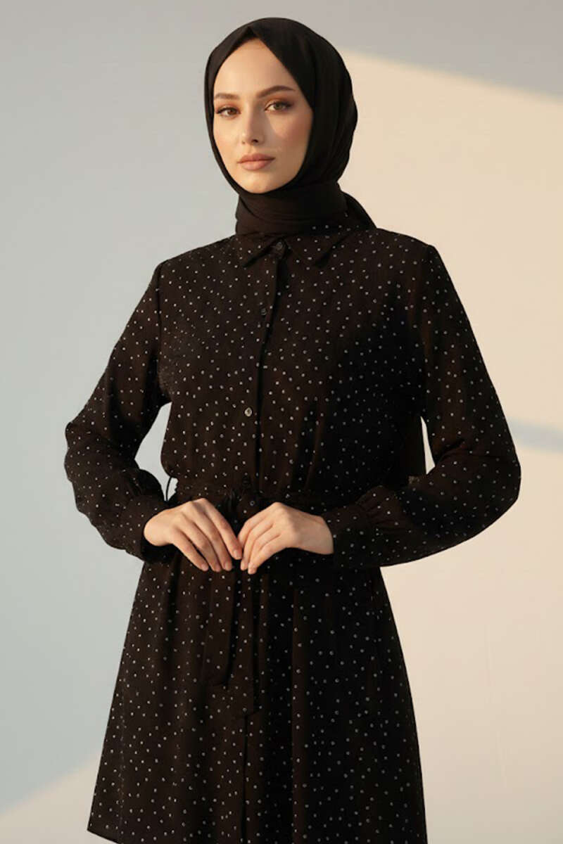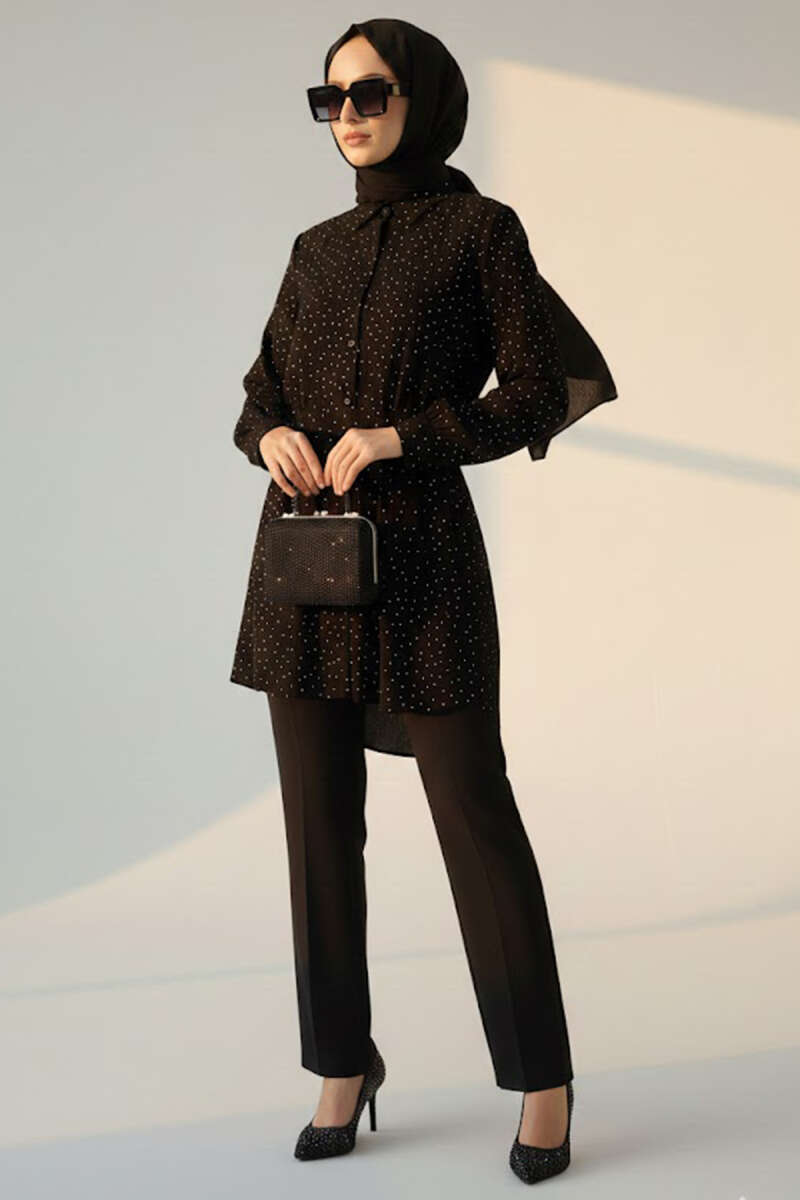 Mini Taş Detaylı Kuşaklı Gömlek Siyah