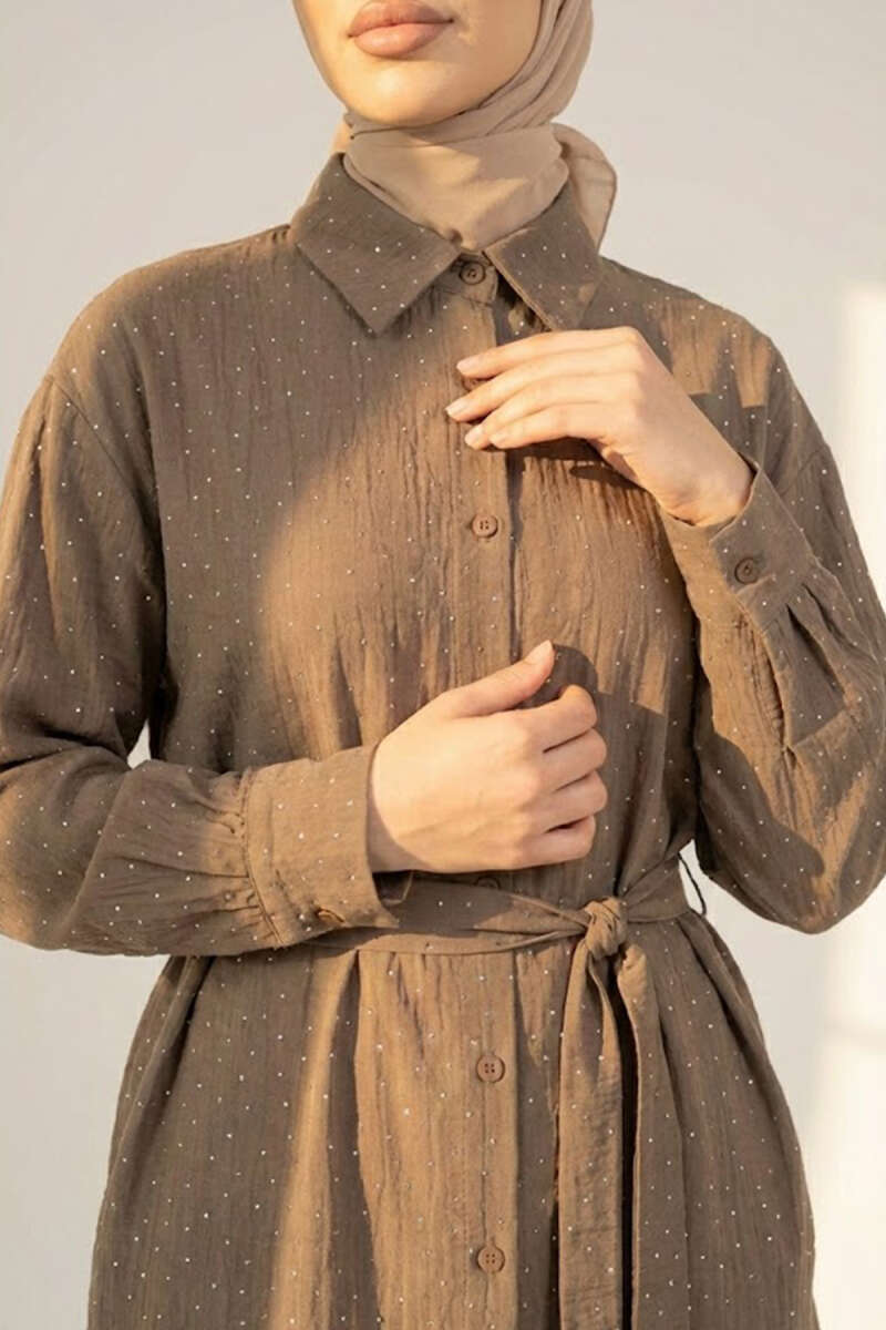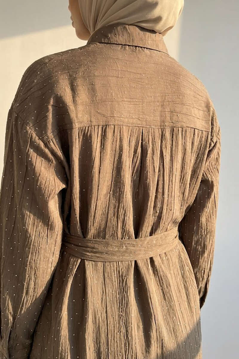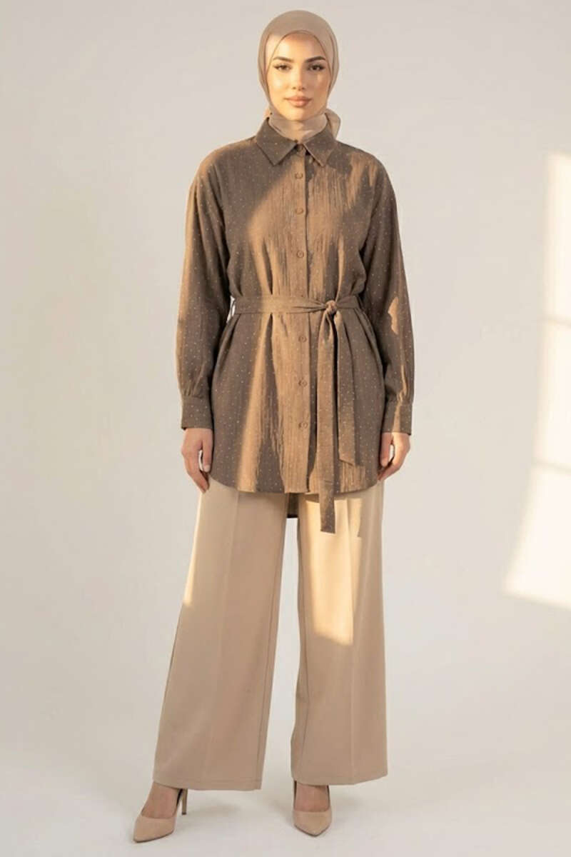 Mini Taş Detaylı Kuşaklı Gömlek Vizon
