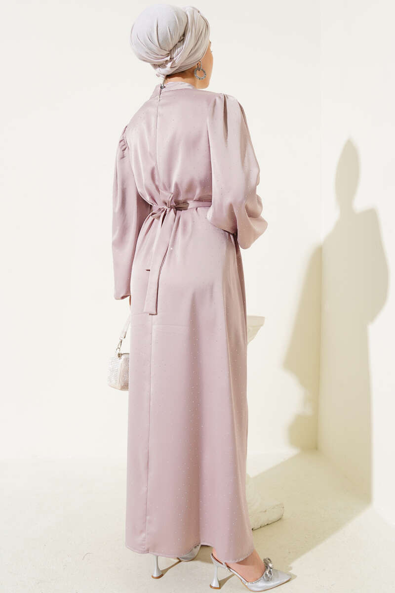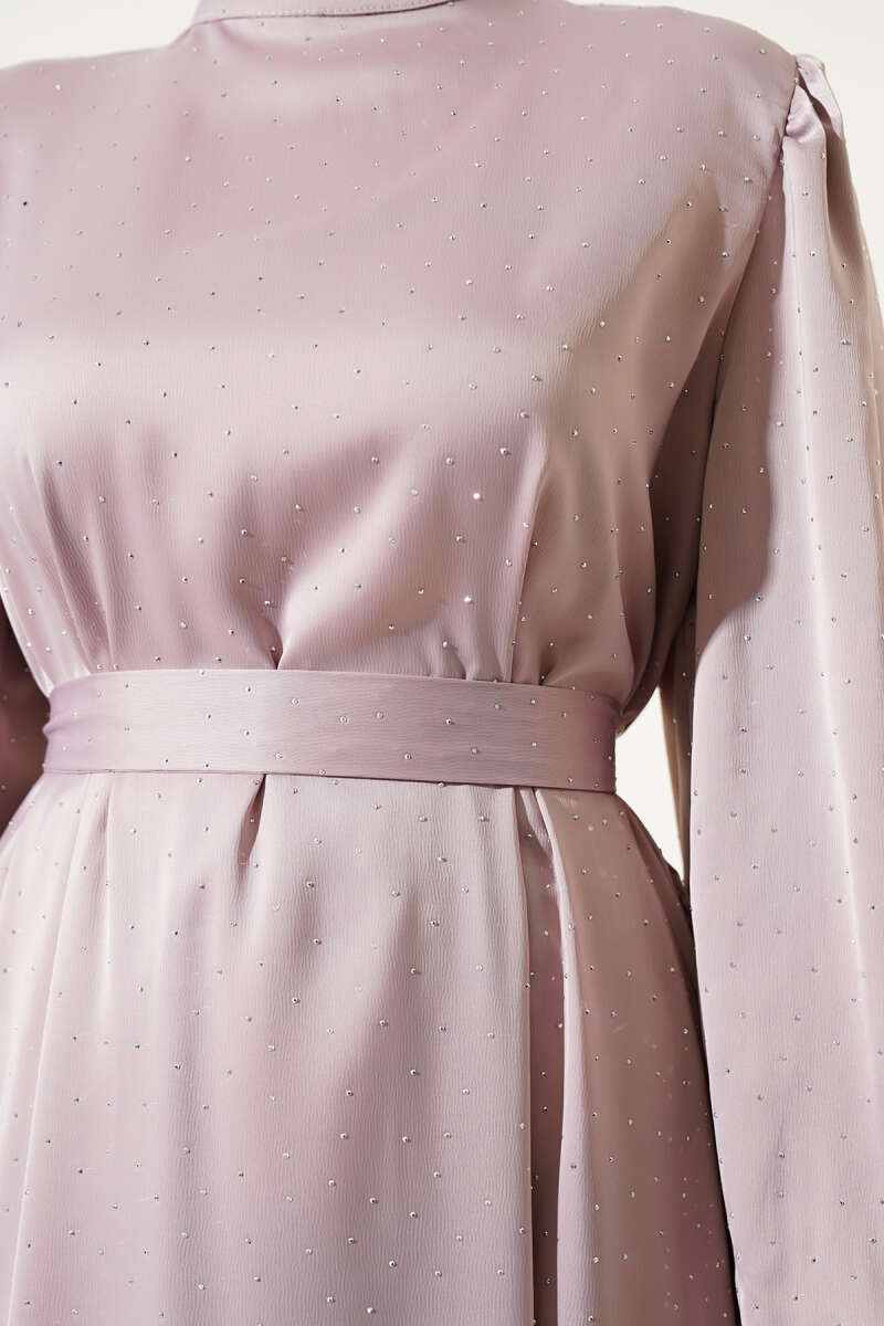 Mini Taşlı Balon Kol Saten Elbise Bej