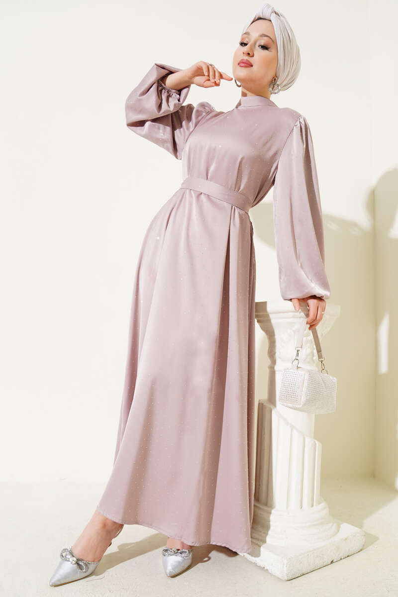 Mini Taşlı Balon Kol Saten Elbise Bordo