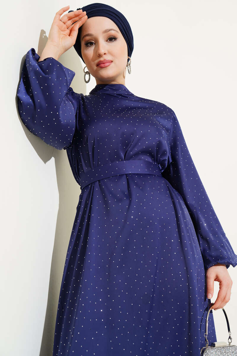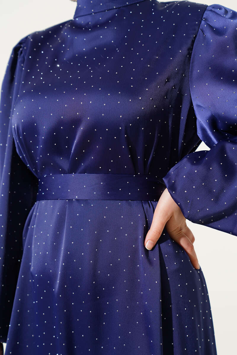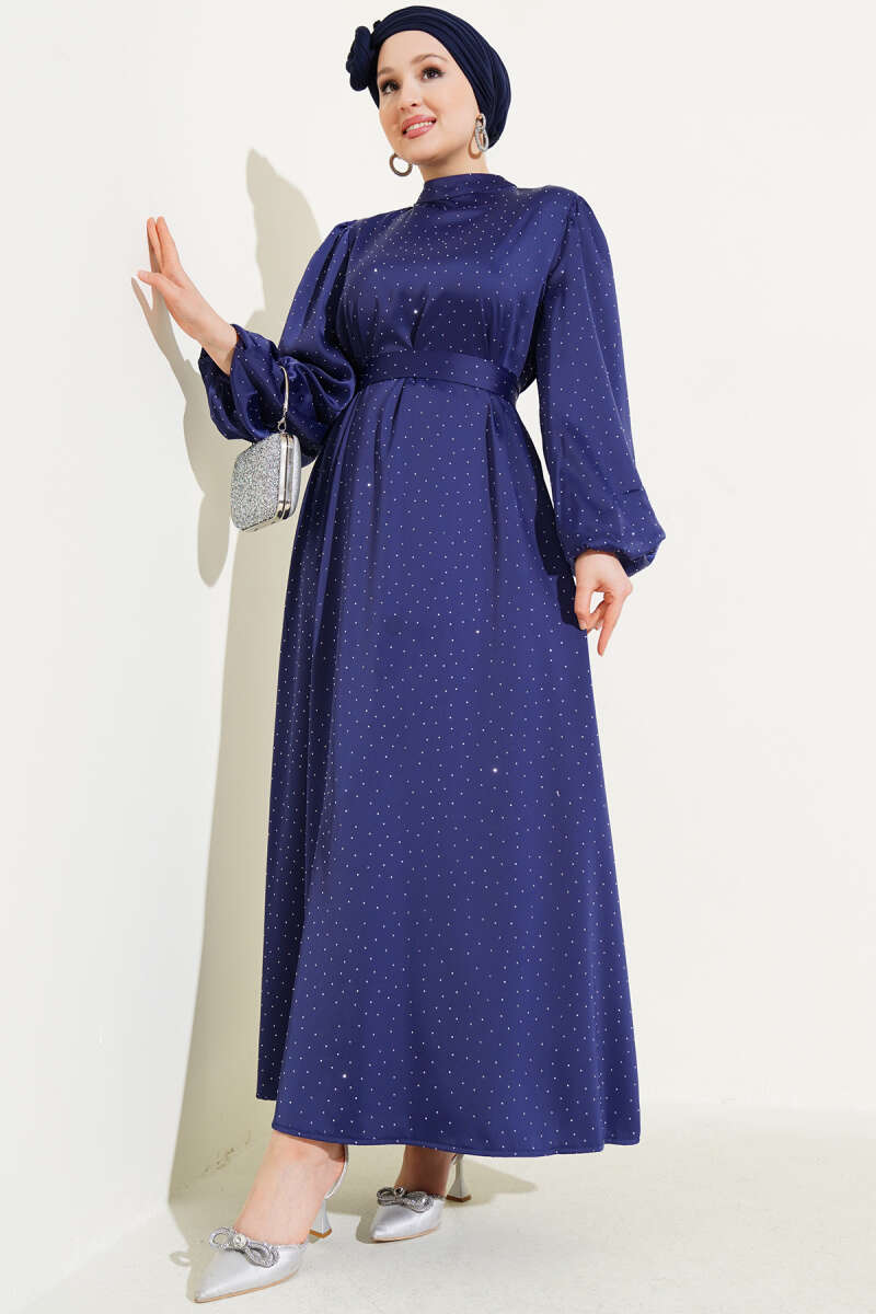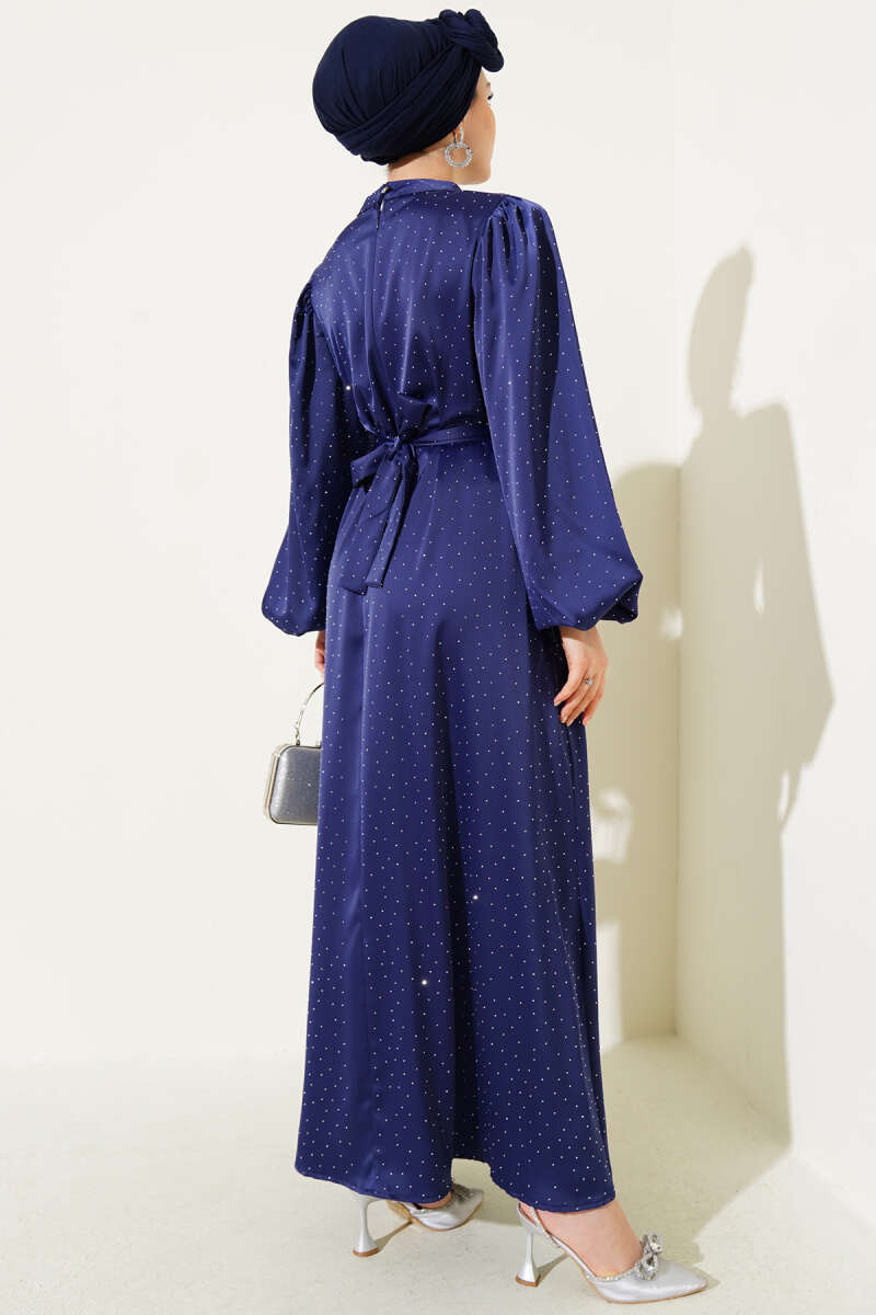 Mini Taşlı Balon Kol Saten Elbise Lacivert