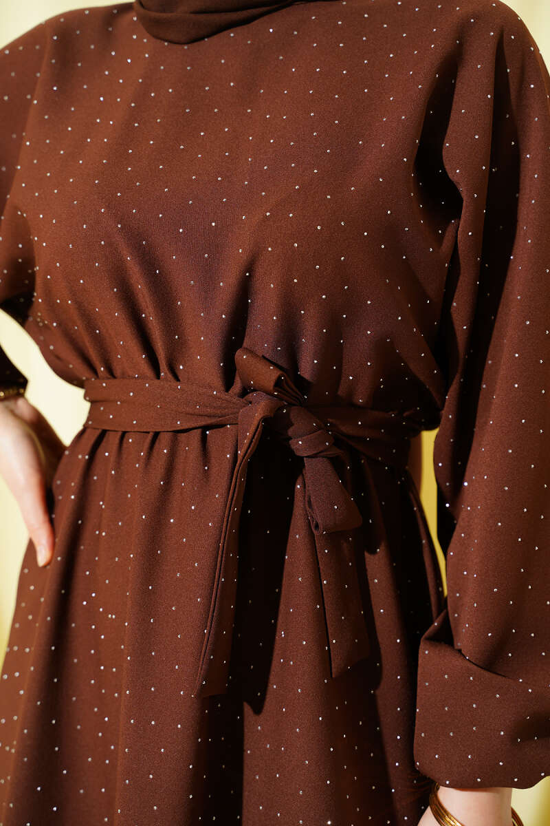 Mini Taşlı Beli Lastikli Elbise Kahve