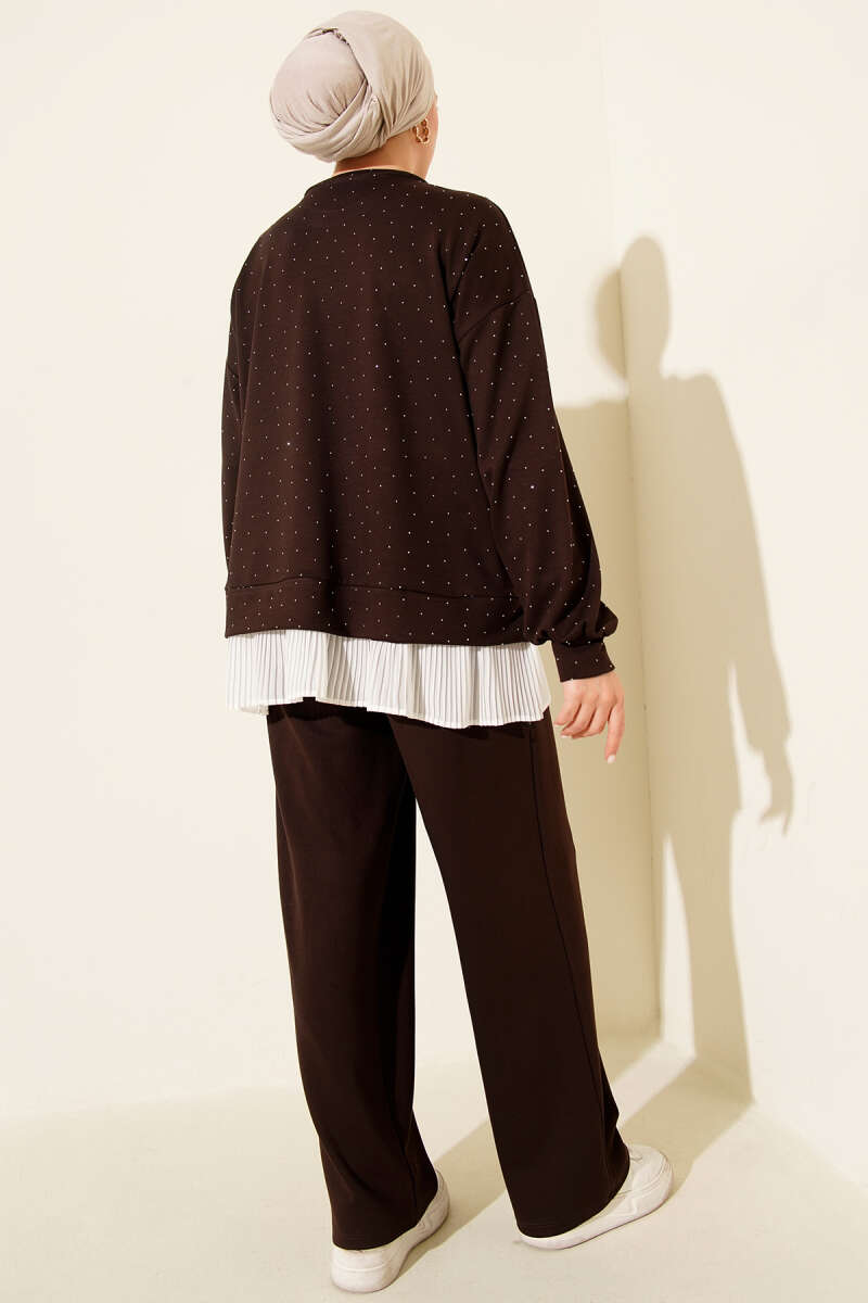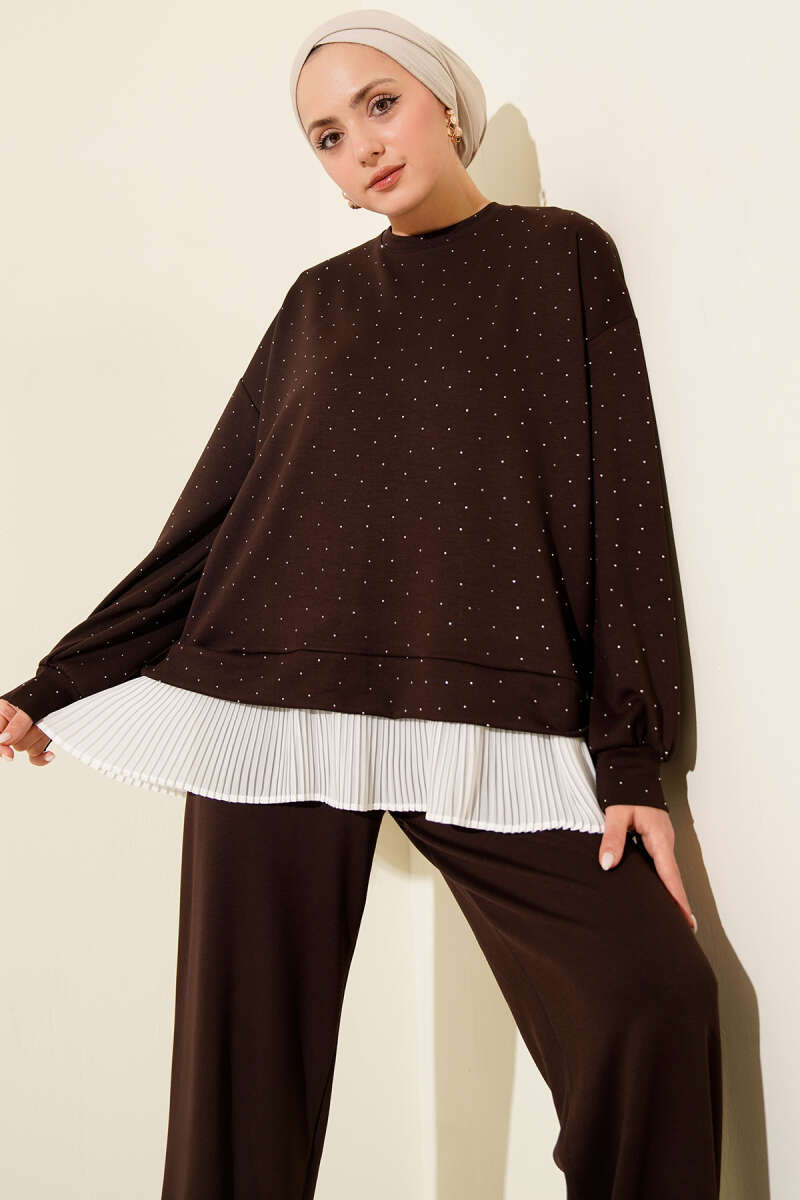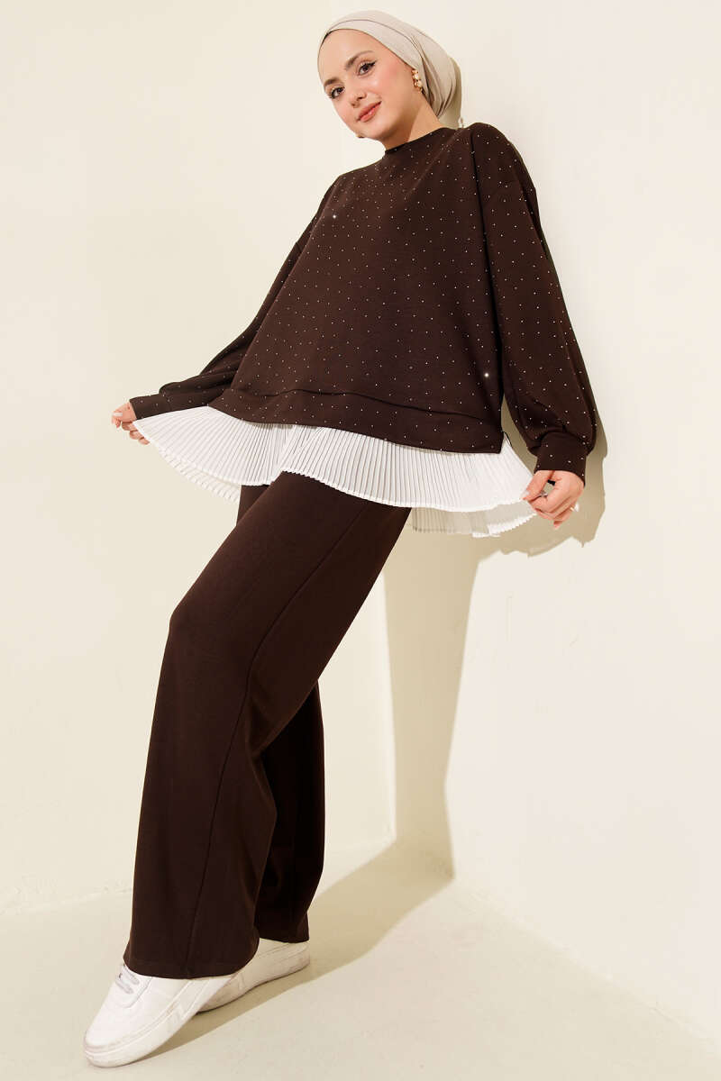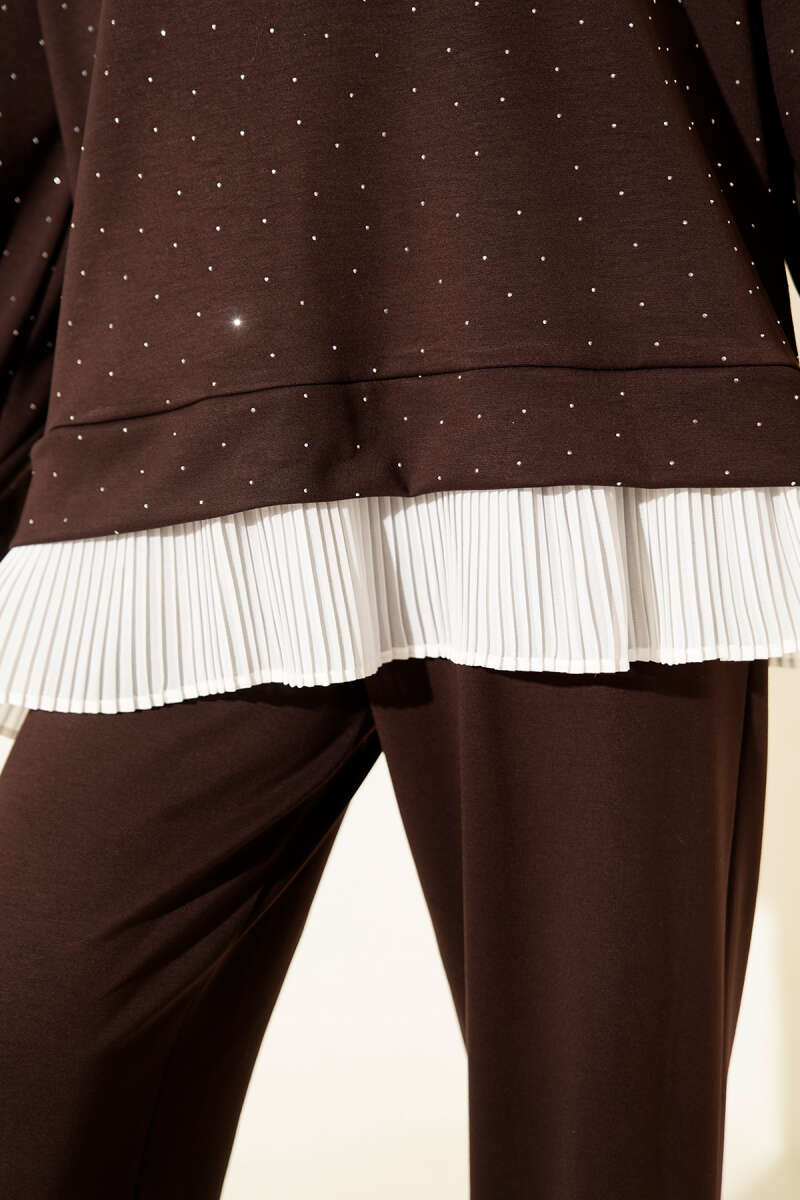Mini Taşlı Fırfırlı Tunik İkili Takım Bej