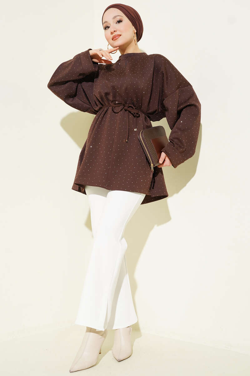 Asimetrik Kabartma Çizgili Triko Tunik Kahve