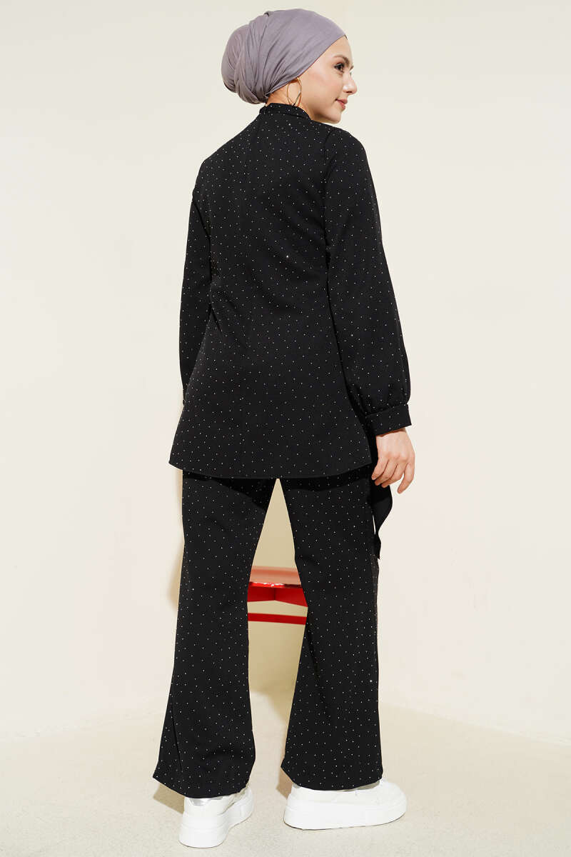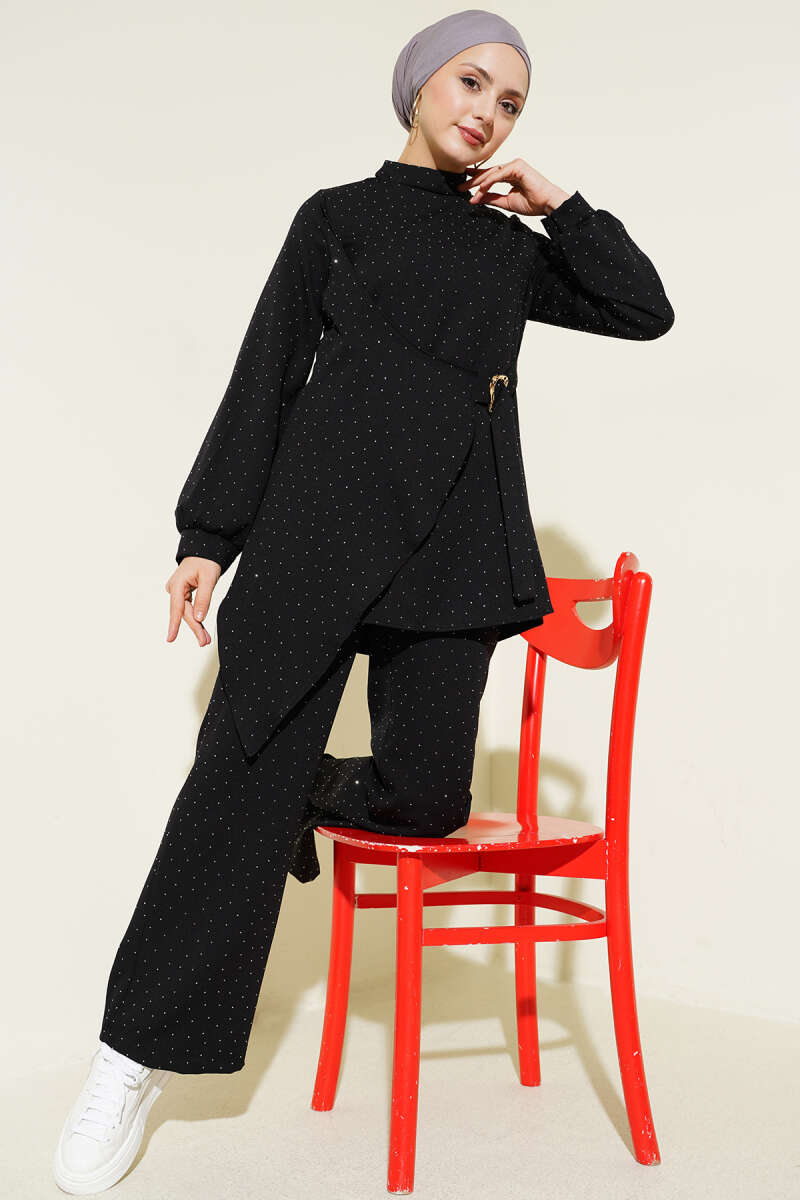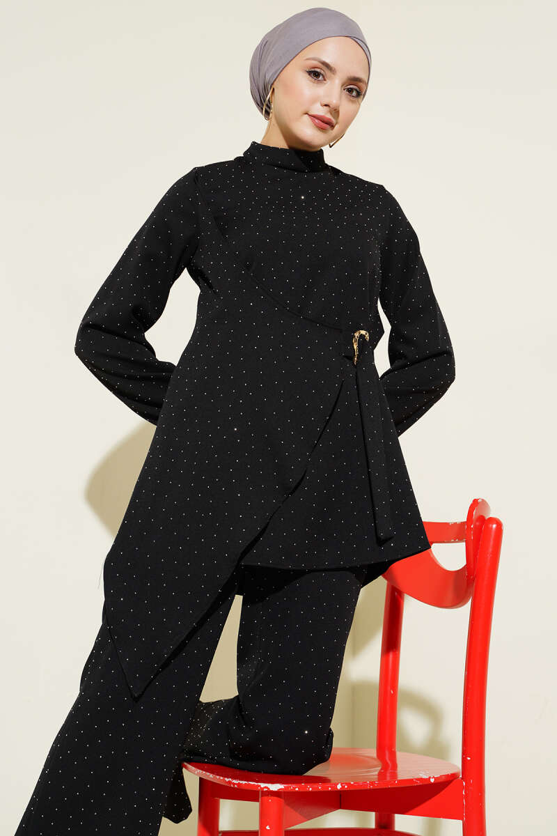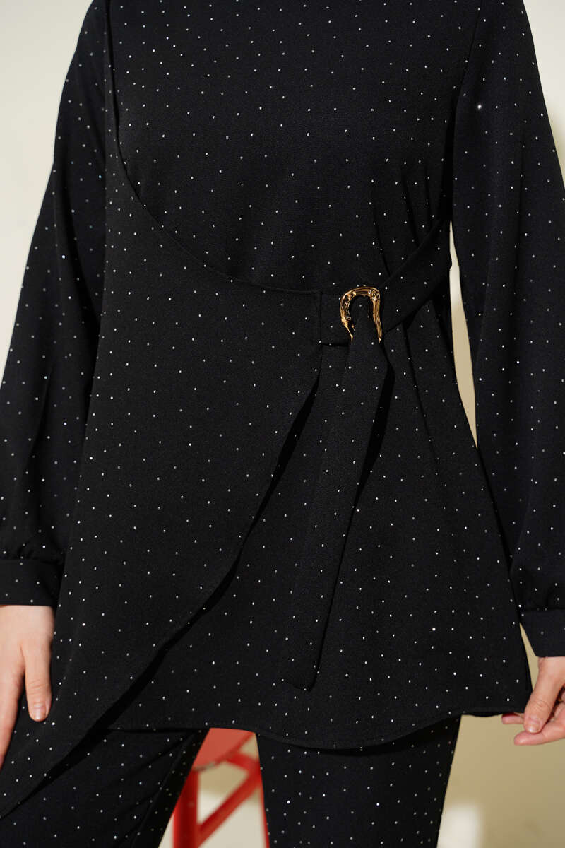 Mini Taşlı Kemer Detaylı İkili Takım Siyah