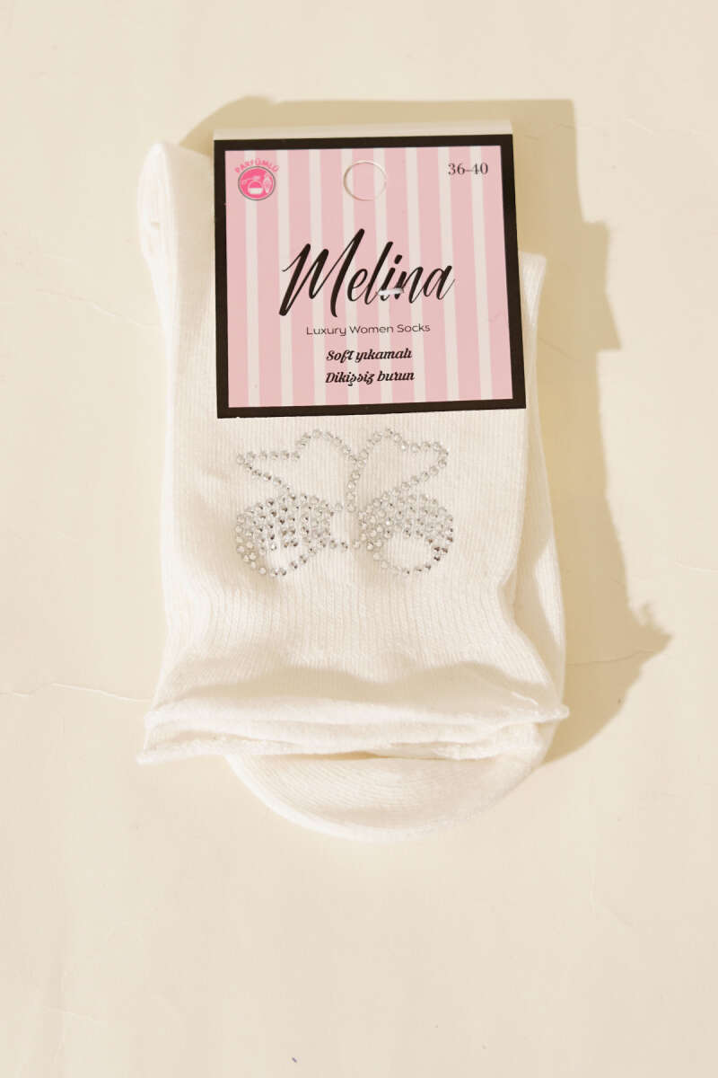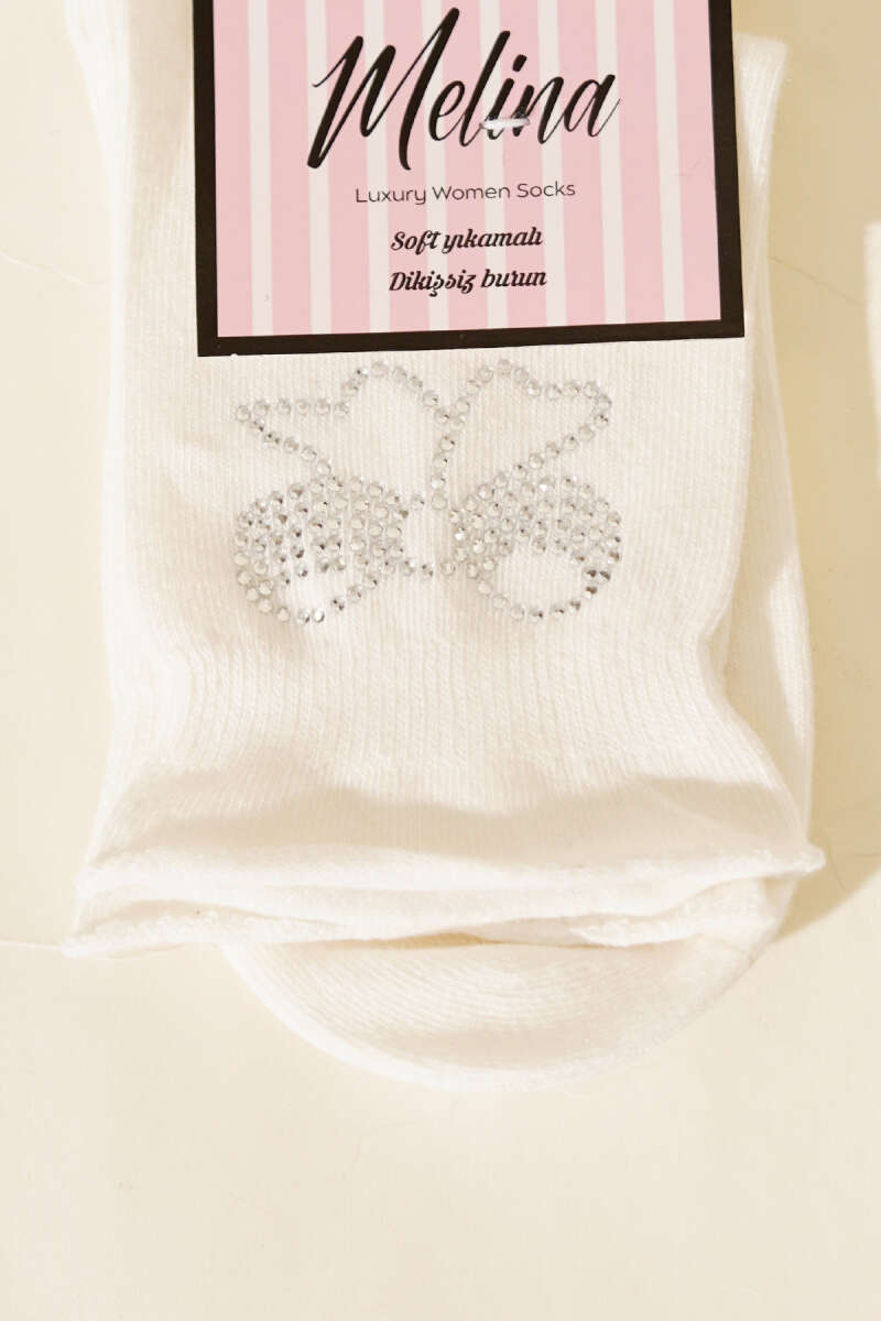 Mini Taşlı Kurdele Soket Çorap Ekru