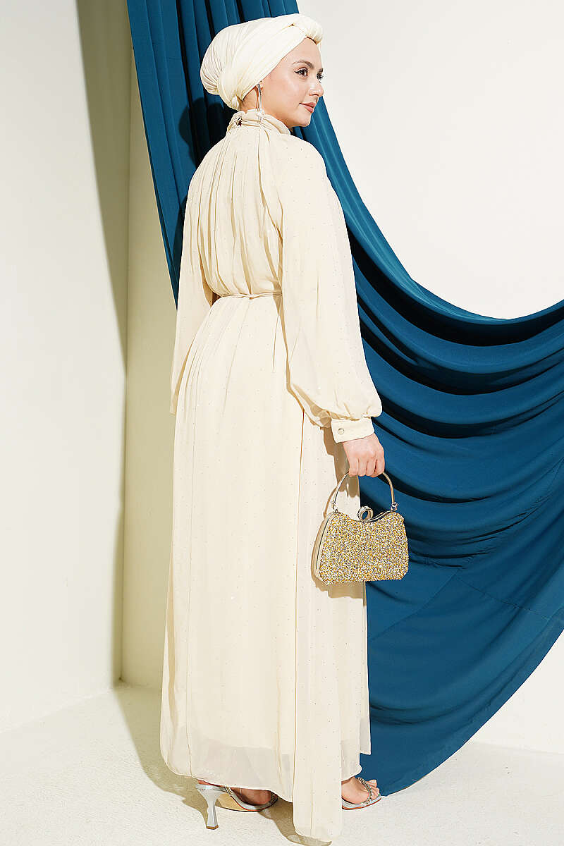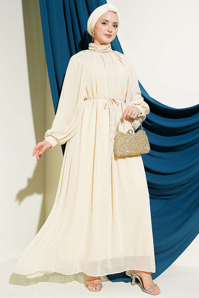 Mini Taşlı Şifon Abiye Elbise Bej