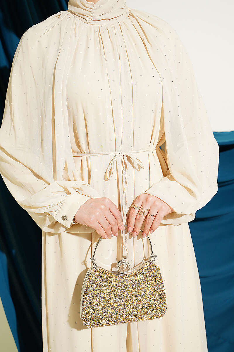 Zarif bir ışıltı sunan bu şifon abiye elbise, üzerindeki minik taş işlemeleriyle özel davetlerde göz alıcı bir şıklık vadeder. Boyun kısmındaki hakim yaka detayı ve dökümlü reglan kolları, tasarıma asil ve modern bir hava katarken estetik bir duruş sergiler. Belindeki ince bağlama detayı sayesinde silueti naifçe vurgulayan bu parça, uçuş uçuş eteği ve akışkan kumaş yapısıyla her adımda zarif bir hareketlilik oluşturur.