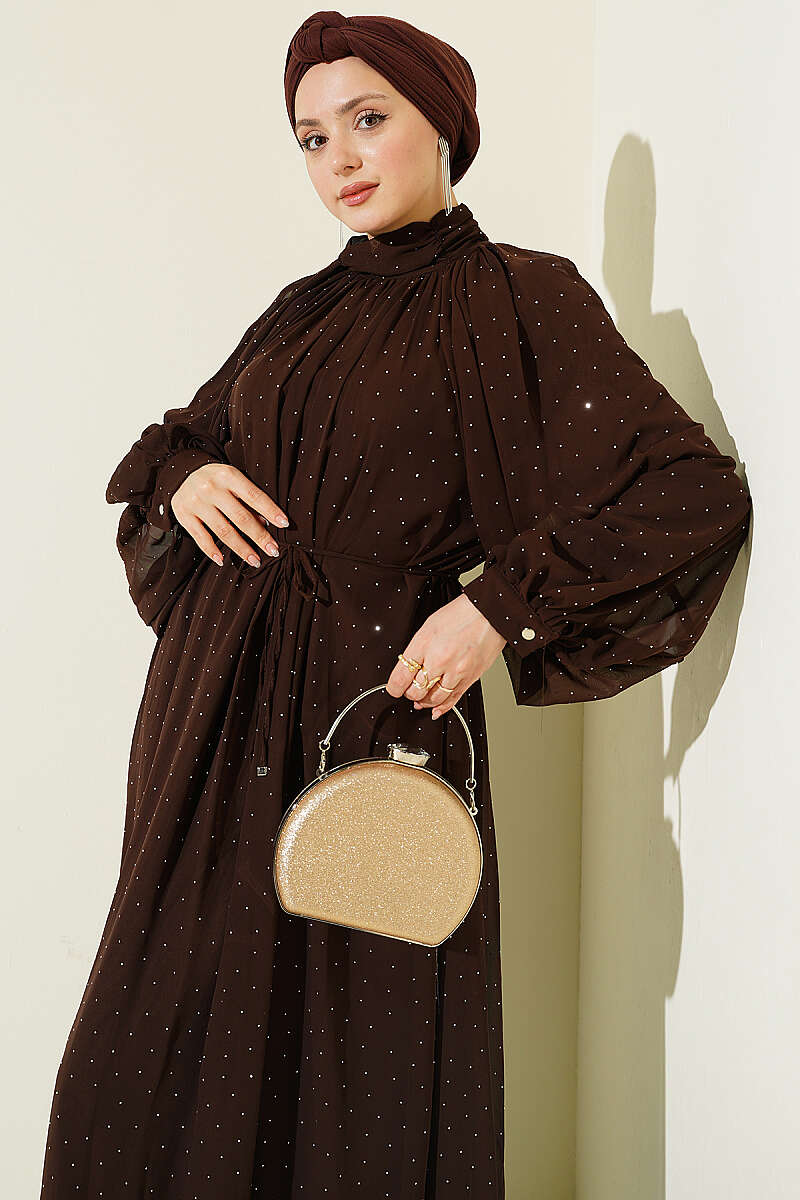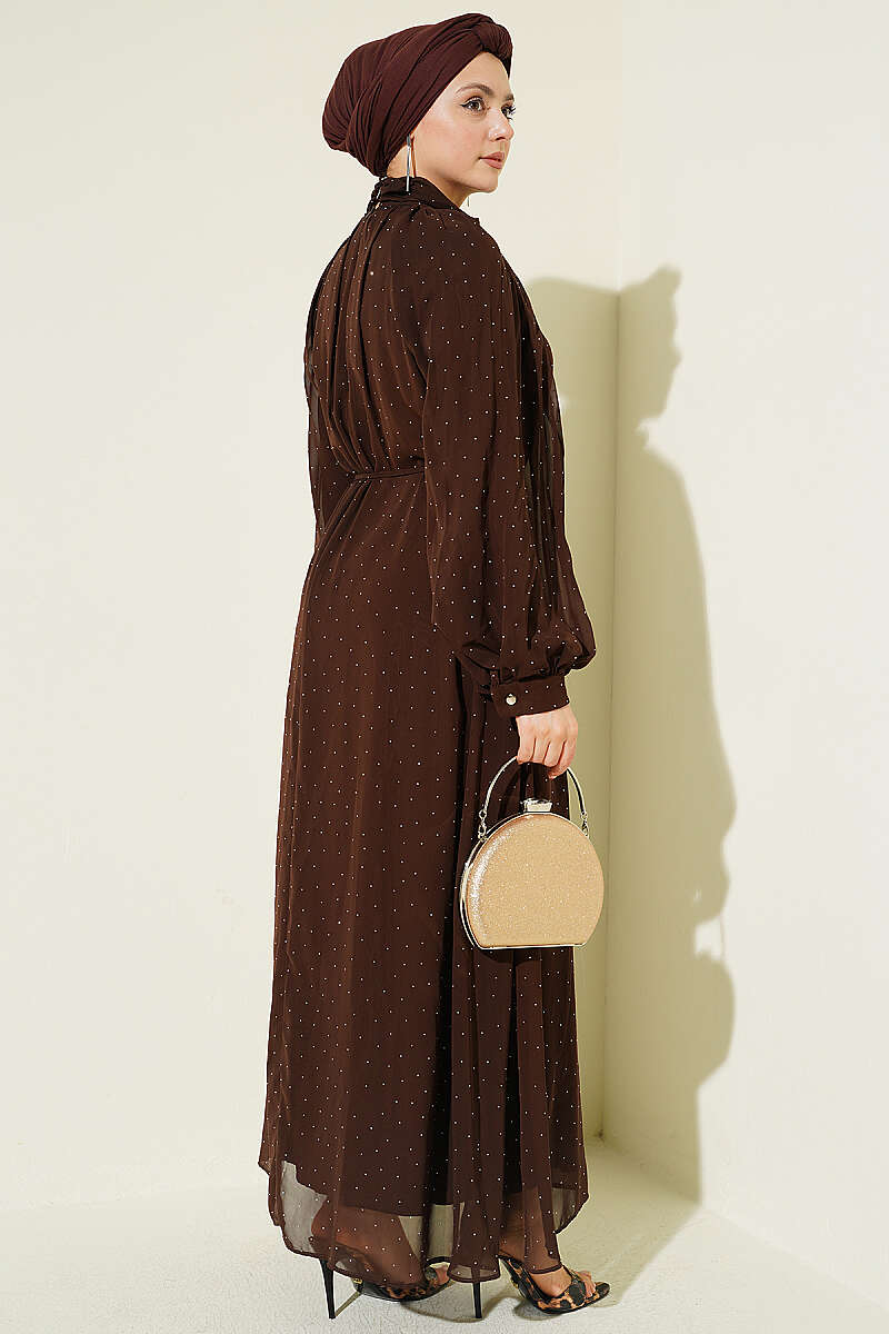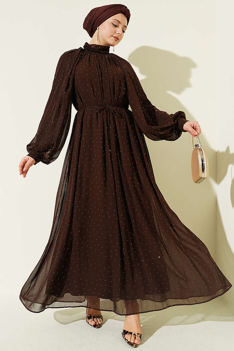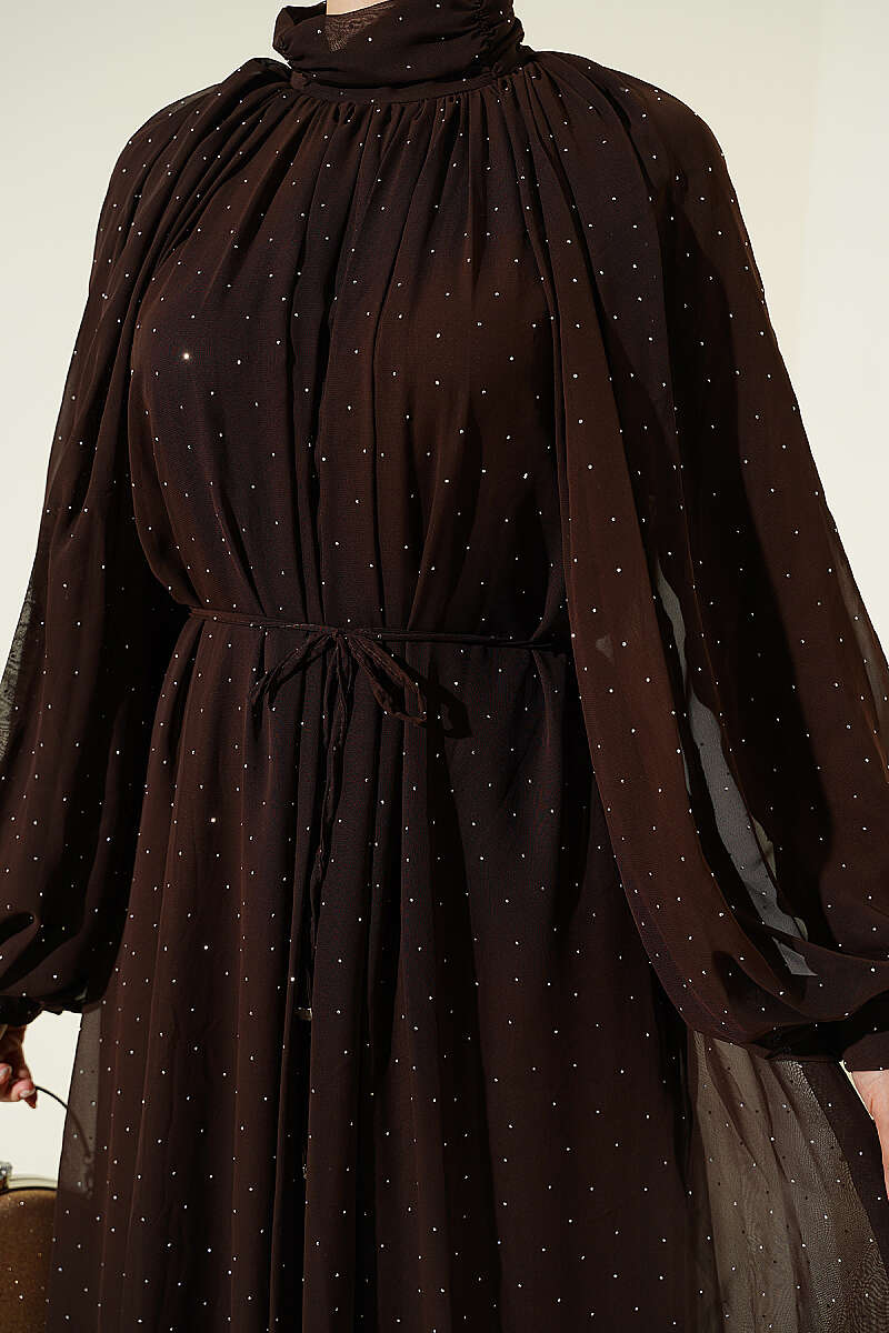 Mini Taşlı Şifon Abiye Elbise Kahve