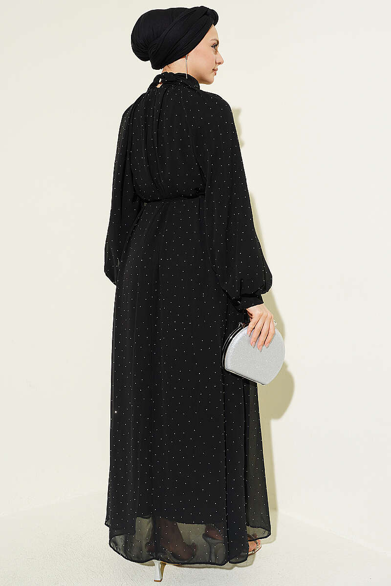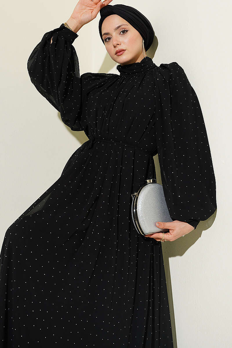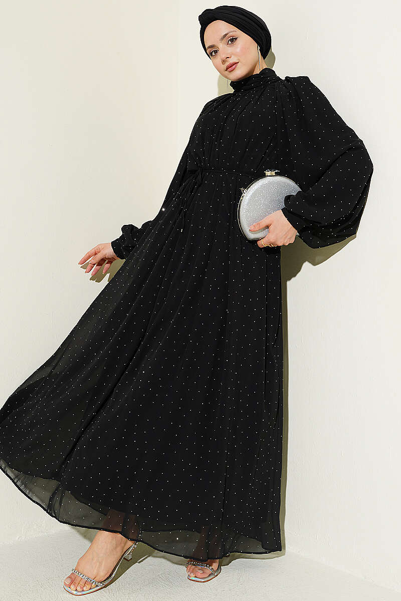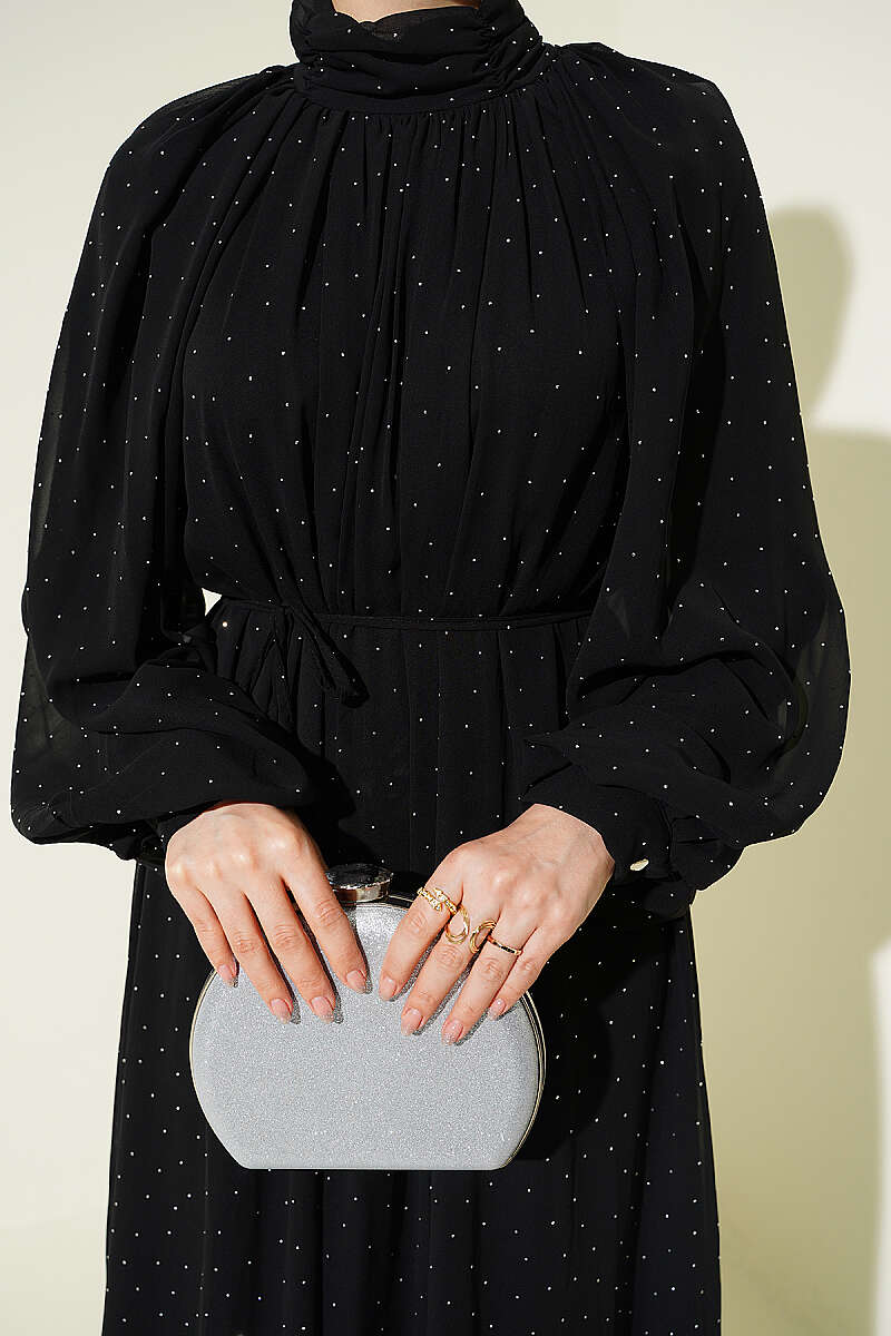 Zarif bir ışıltı sunan bu şifon abiye elbise, üzerindeki minik taş işlemeleriyle özel davetlerde göz alıcı bir şıklık vadeder. Boyun kısmındaki hakim yaka detayı ve dökümlü reglan kolları, tasarıma asil ve modern bir hava katarken estetik bir duruş sergiler. Belindeki ince bağlama detayı sayesinde silueti naifçe vurgulayan bu parça, uçuş uçuş eteği ve akışkan kumaş yapısıyla her adımda zarif bir hareketlilik oluşturur.