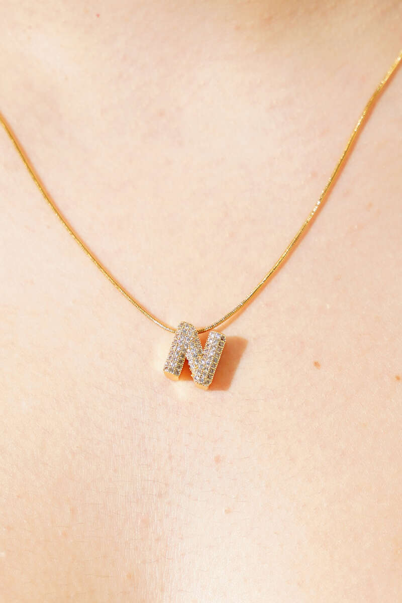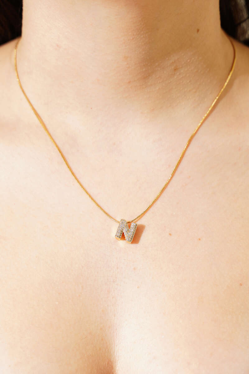 Modern N Harfi Taş İşlemeli Kolye Gold
