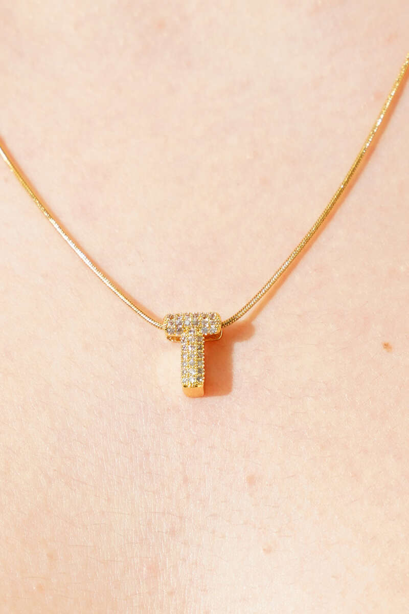 Modern T Harfi Taş İşlemeli Kolye Gold