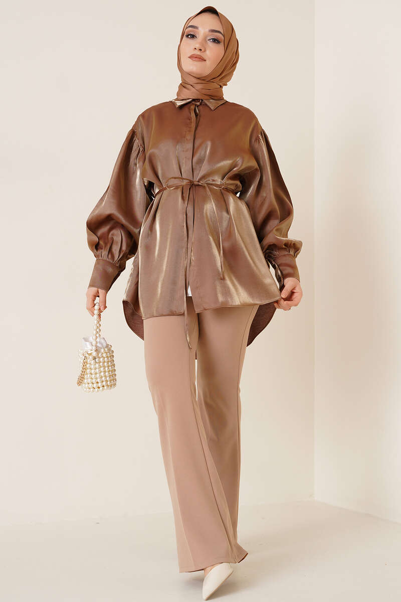 Gizli Düğmeli Bel Kuşaklı Gömlek Pembe