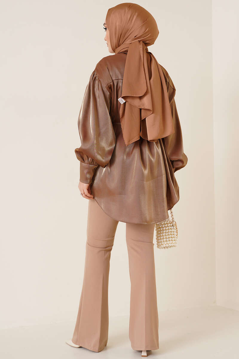 Taş Düğmeli Omuz Pileli Gömlek Bej