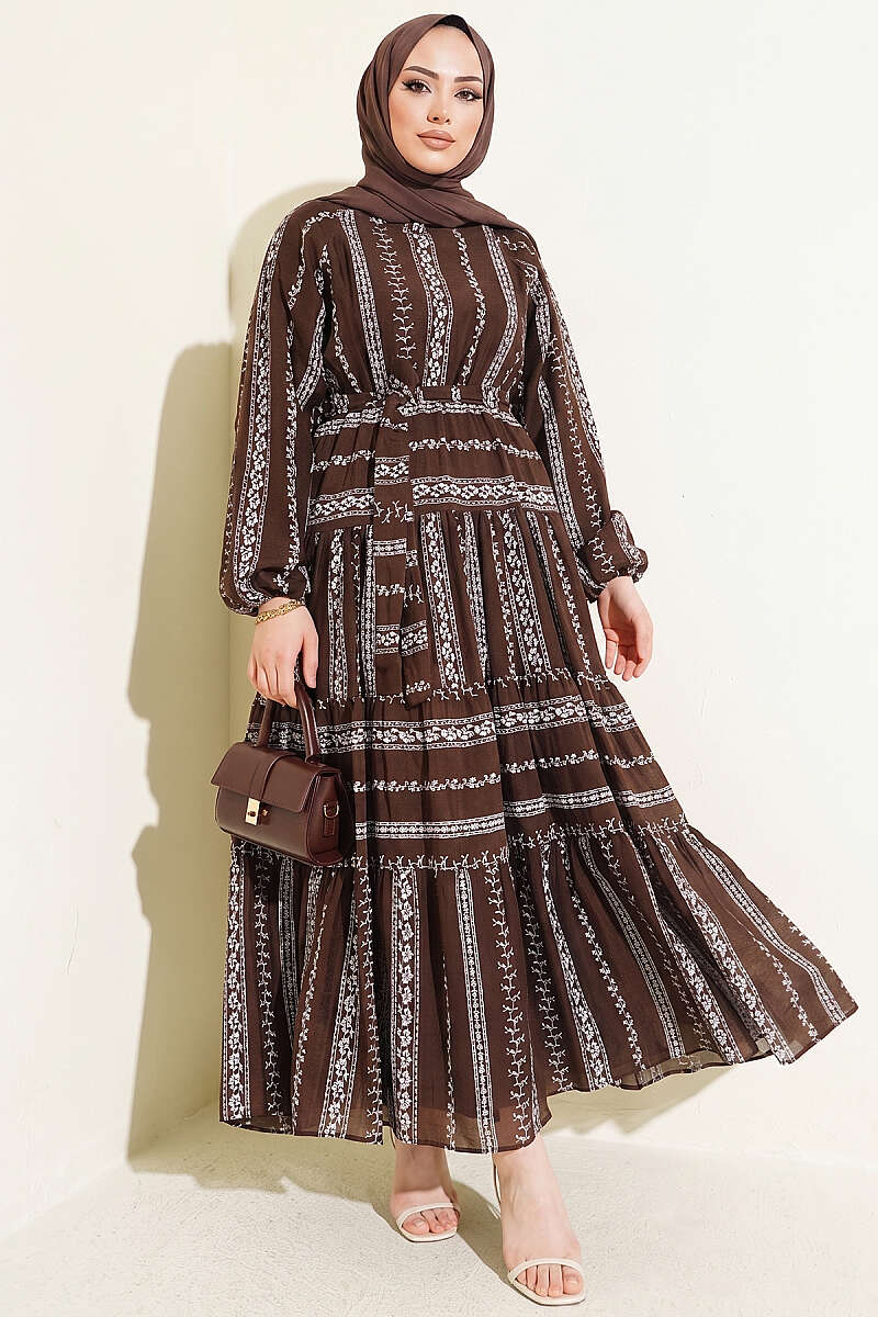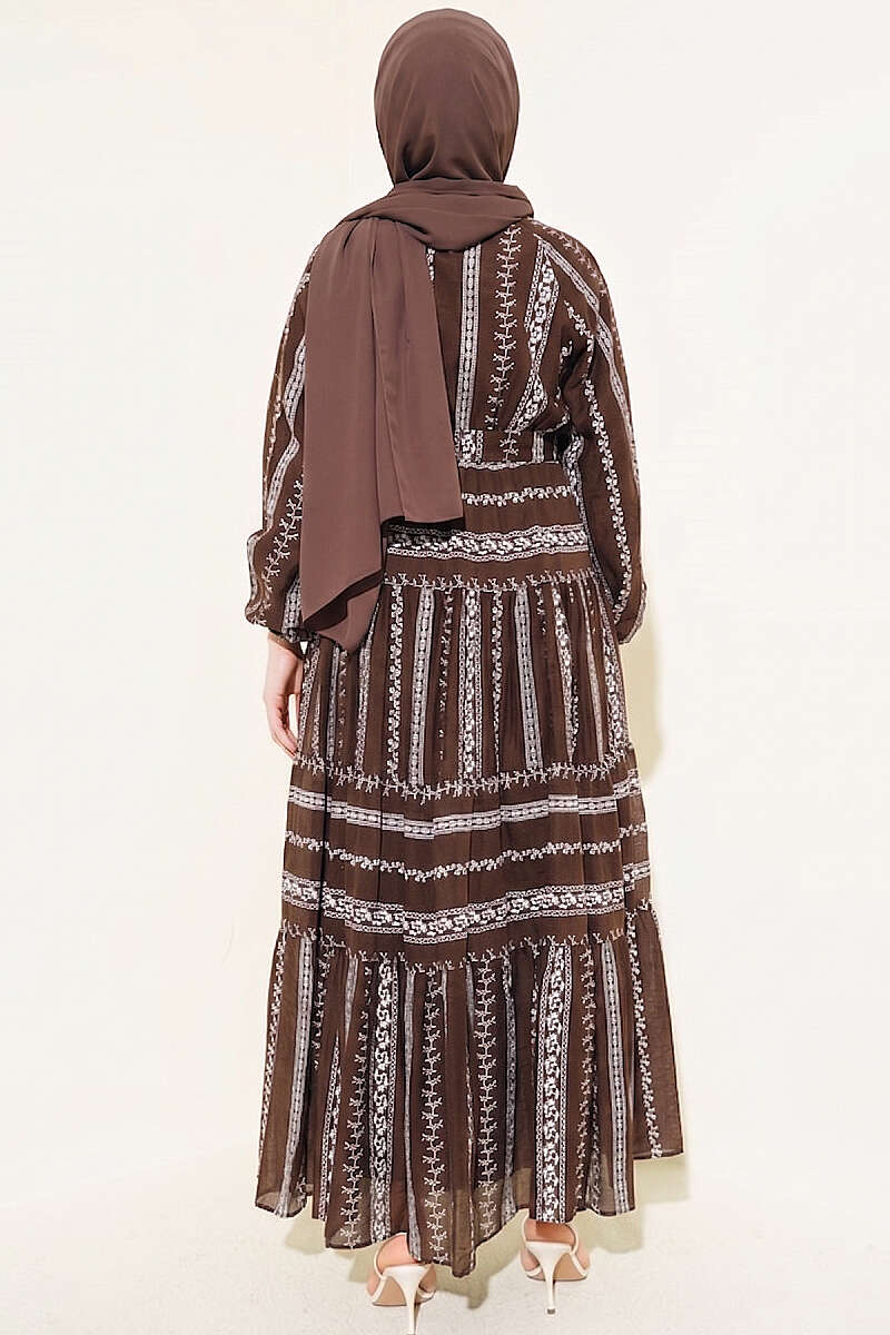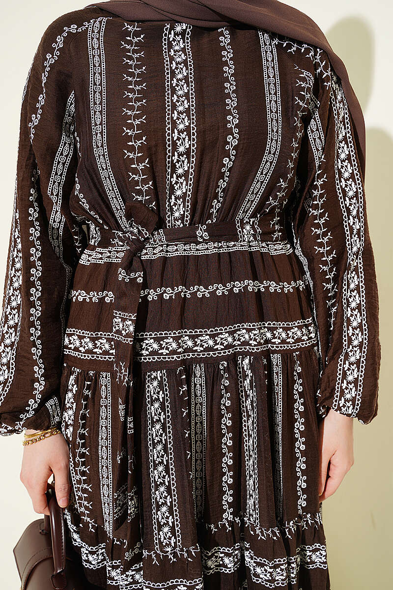 Nakış Detaylı Bağcıklı Elbise Kahve