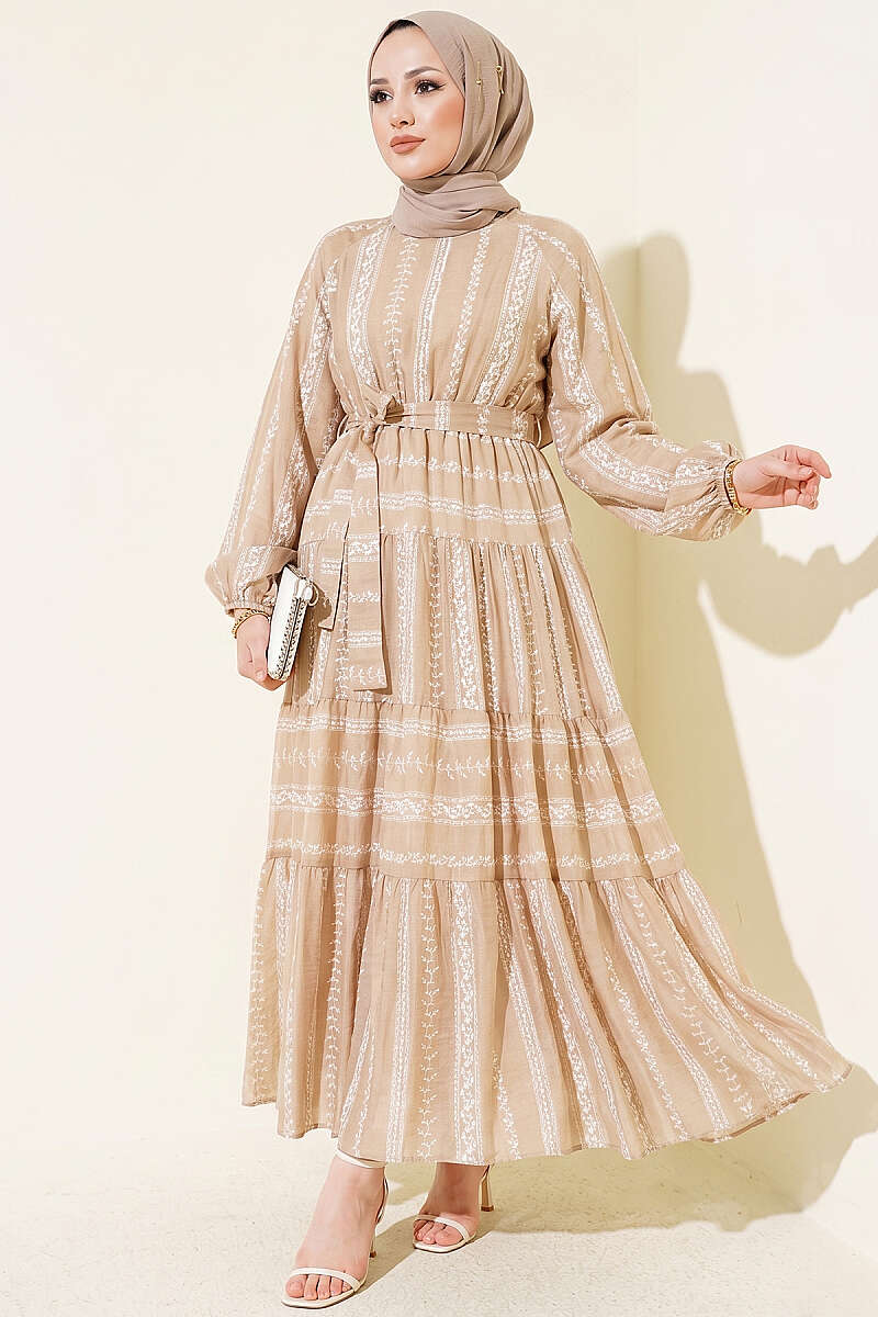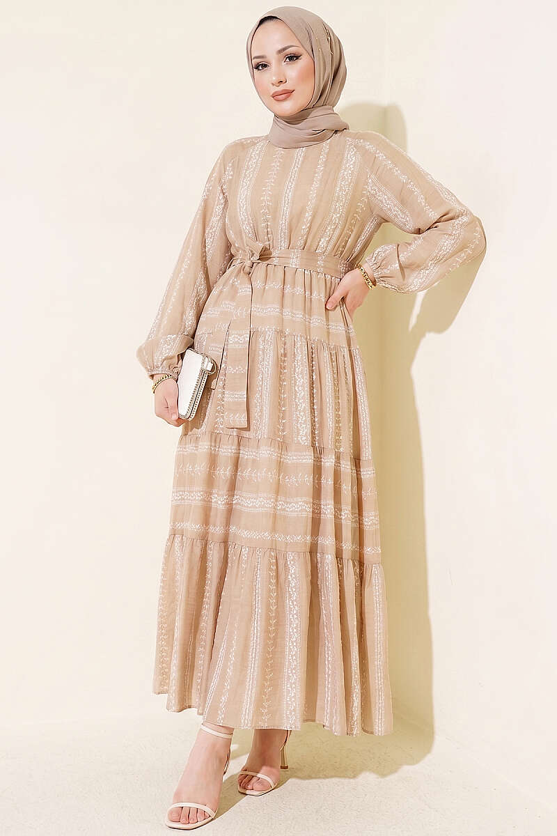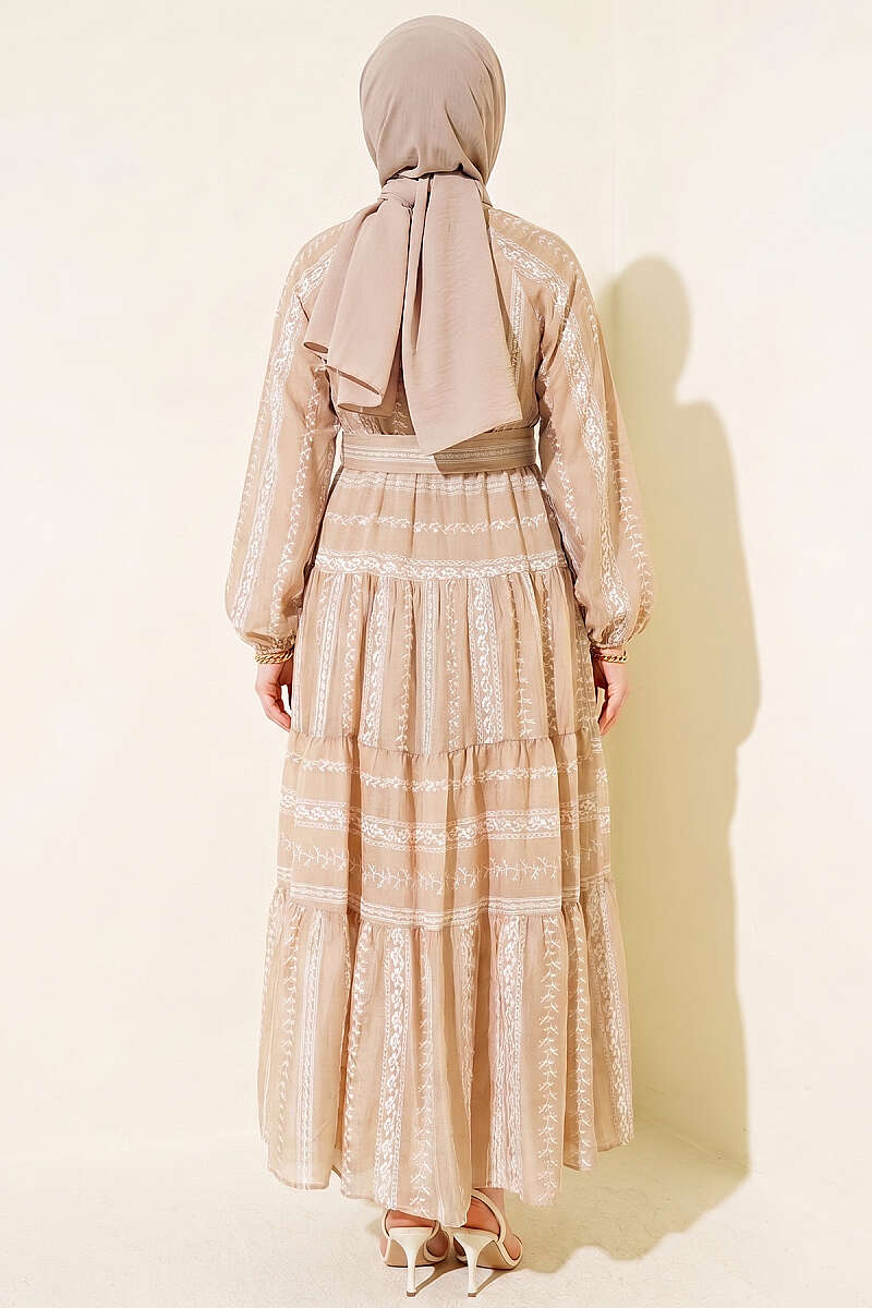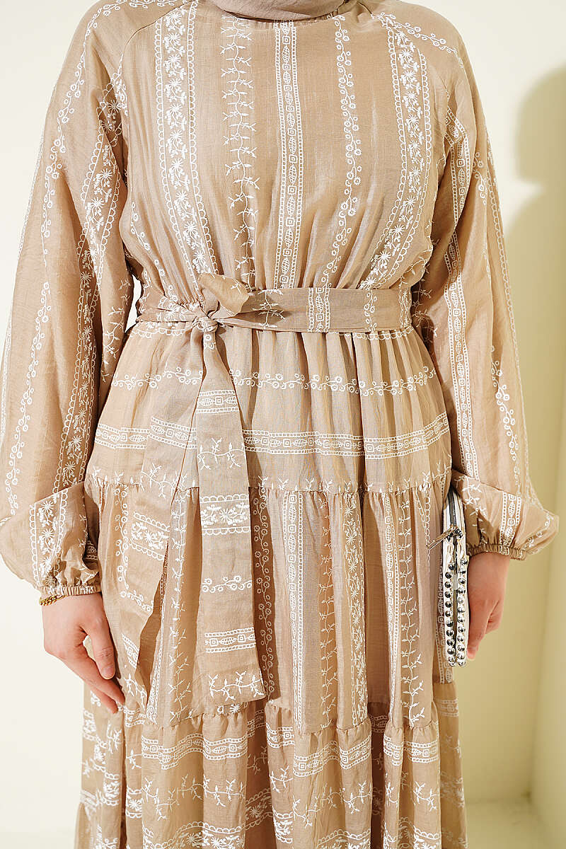 Nakış Detaylı Bağcıklı Elbise Vizon