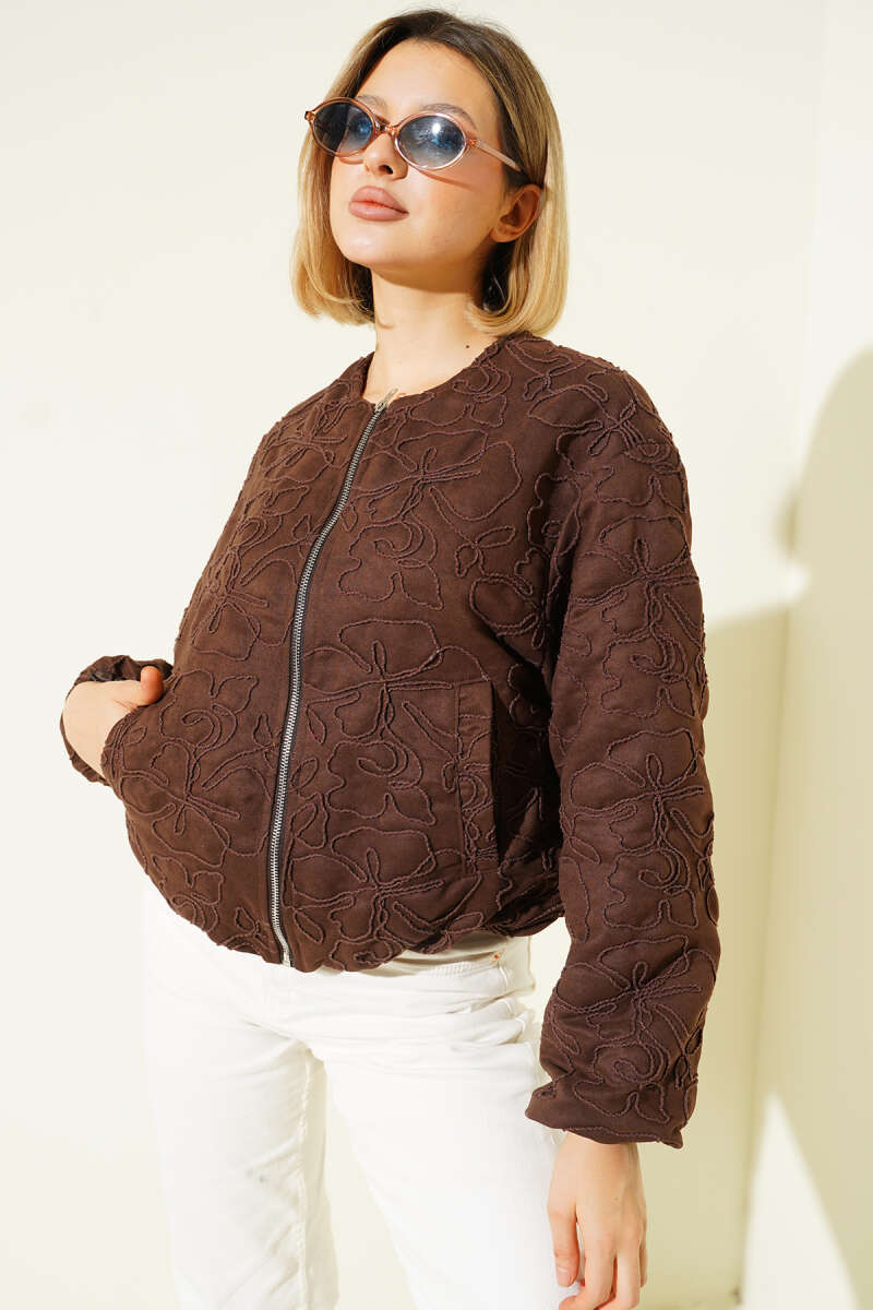 Kruvaze Yaka Kapitone Kuşaklı Mont Kahve