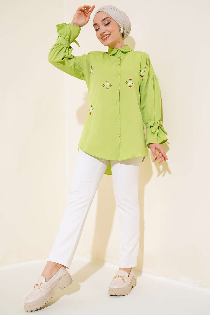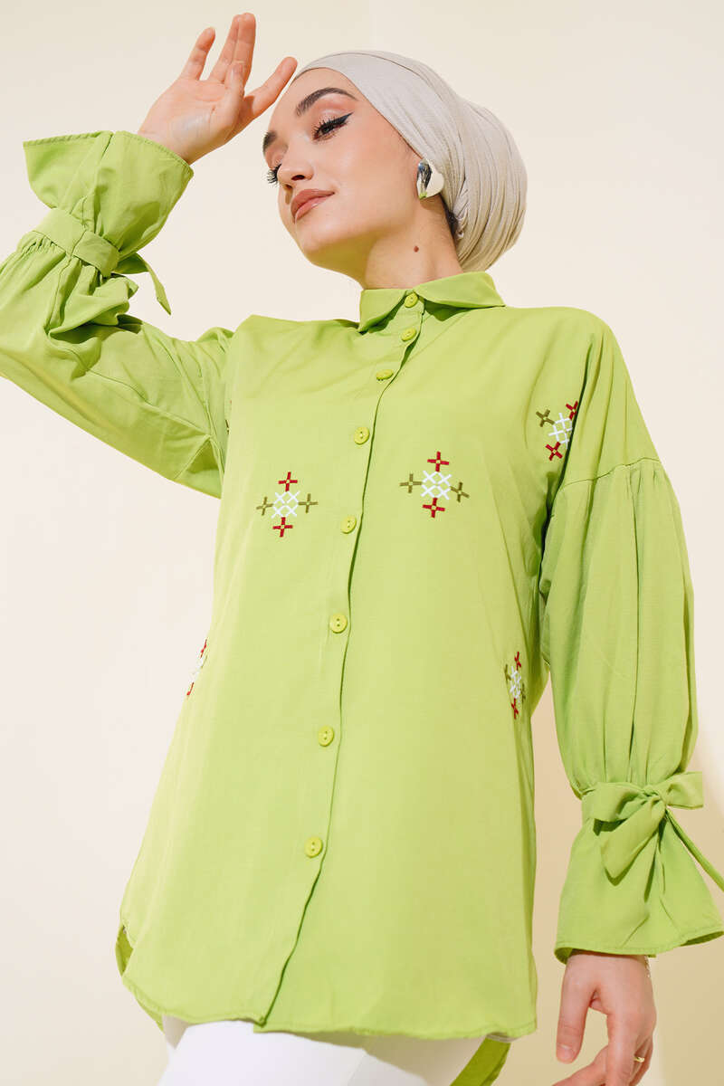 Yeni sezon gömleğimiz bu yazın favori modeli olacaktır. Önünde bulunan nakış detayları gömleğimize hareket kazandırmıştır. Bilekleri hem lastikli hem de bağlamalıdır. Klasik yaka olan gömleğimiz düşük omuz modeldir.