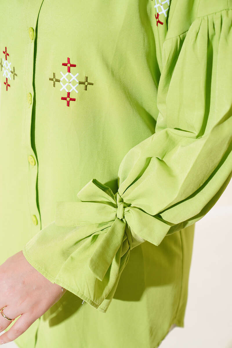 Ürün BilgisiModelin üzerindeki ürün - 38 - bedendir. Boy: 75 cmGöğüs: 108 cmBel: 100 cmYeni sezon gömleğimiz bu yazın favori modeli olacaktır. Önünde bulunan nakış detayları gömleğimize hareket kazandırmıştır. Bilekleri hem lastikli hem de bağlamalıdır. Klasik yaka olan gömleğimiz düşük omuz modeldir.Kumaş Bilgisi%90 Polyester%10 ViskonModel BilgisiBoy : 165 cmGöğüs : 86 cmBel : 67 cmKalça : 85 cm