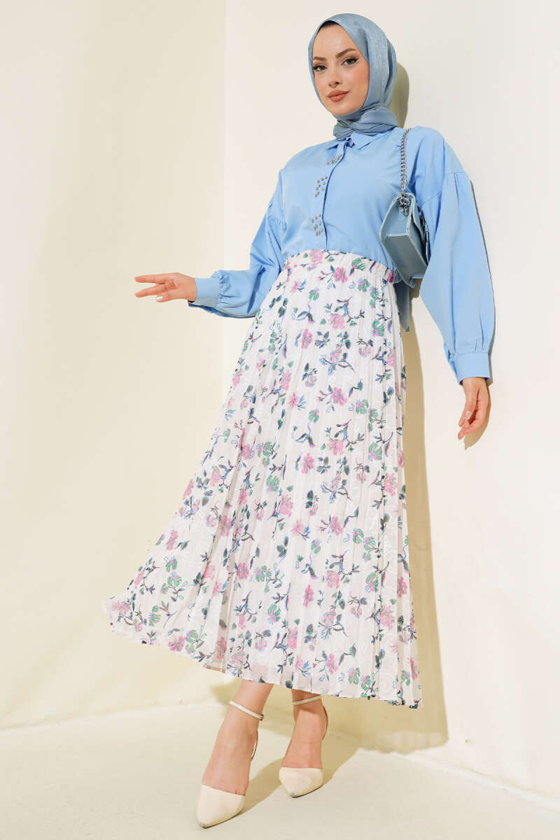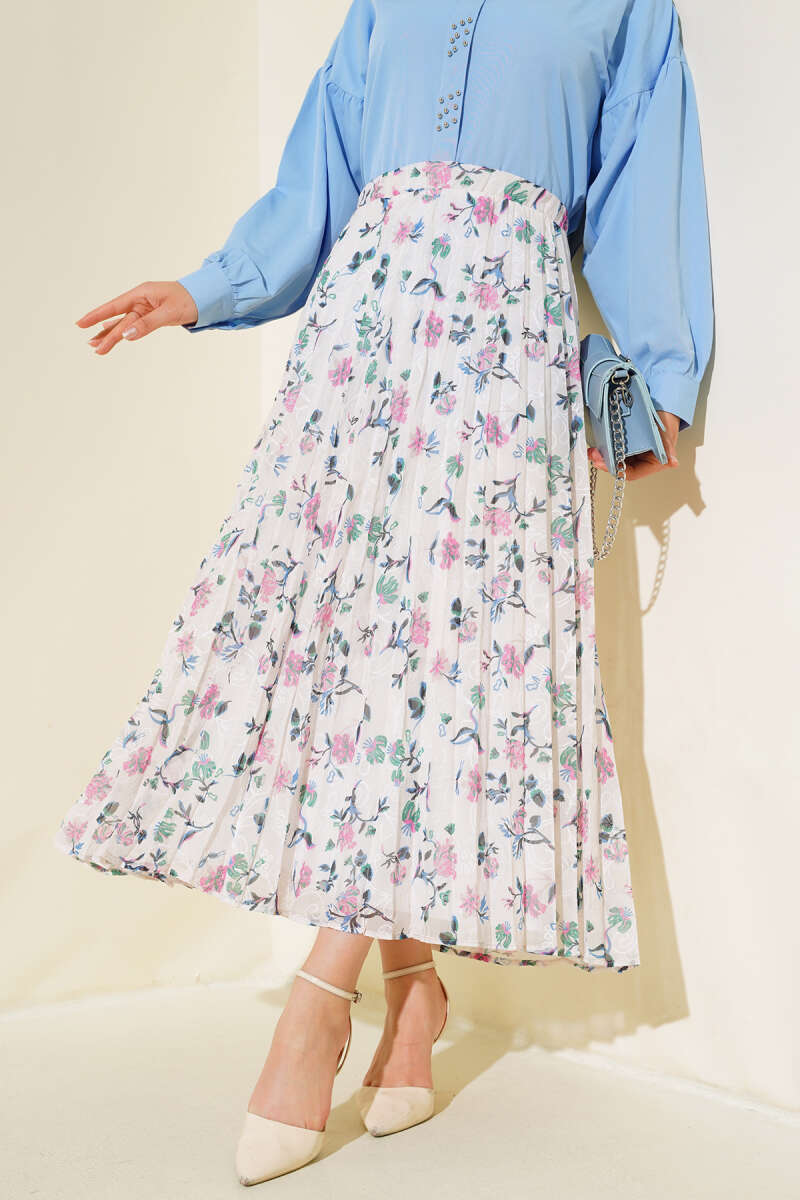 Çiçek Desenli Piliseli Şifon Etek Haki