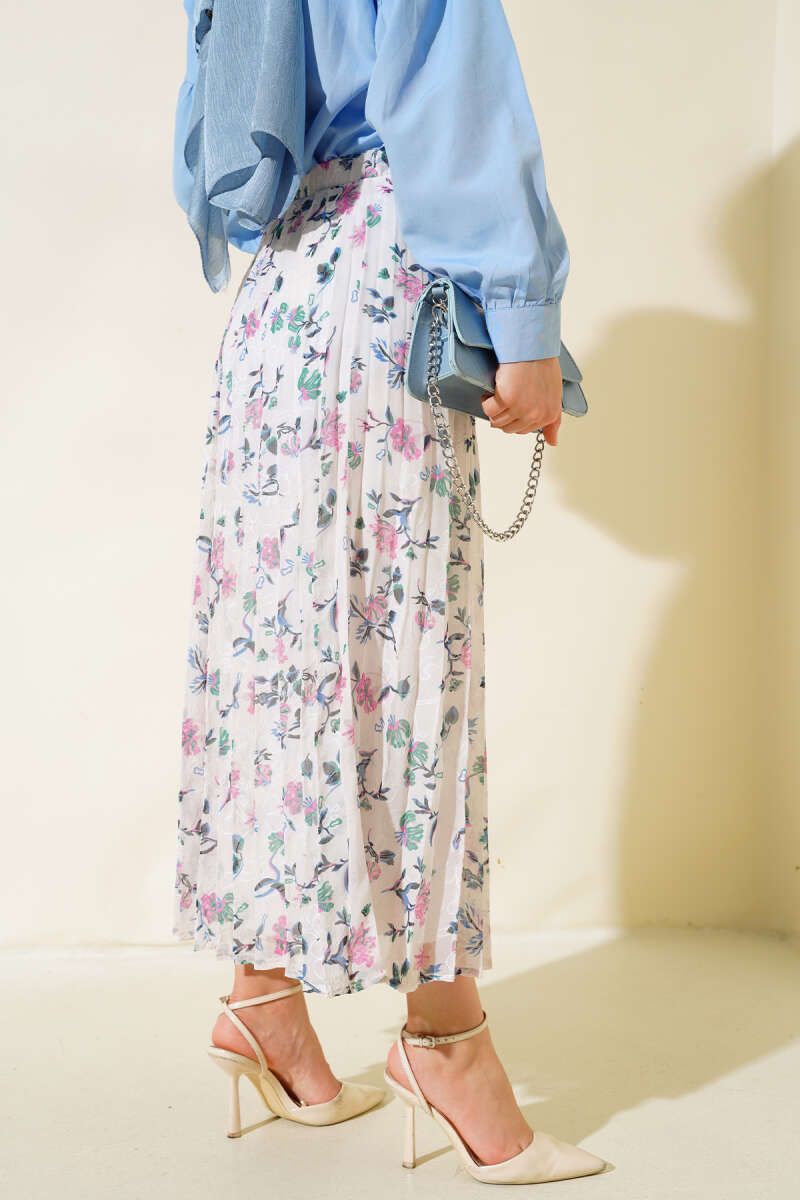 Çiçek Desenli Piliseli Şifon Etek Kahve