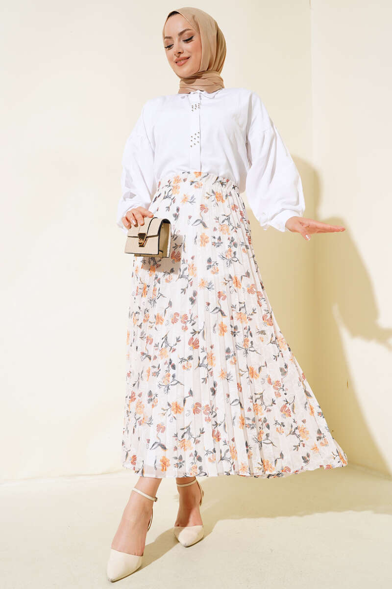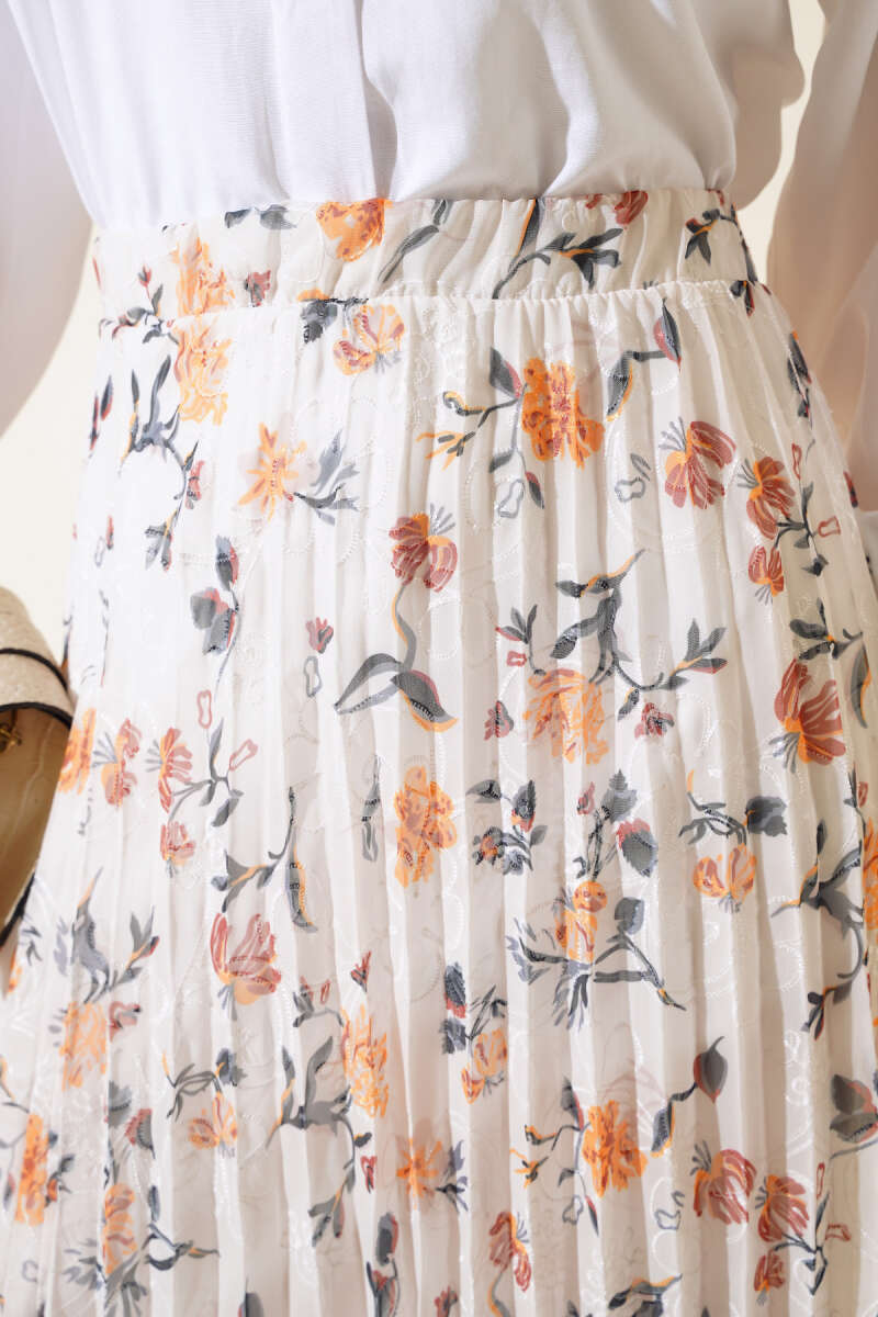 Çiçek Desenli Piliseli Şifon Etek Haki