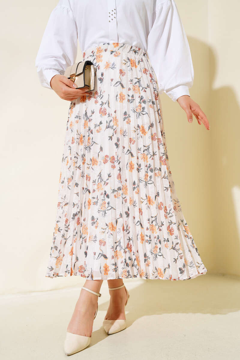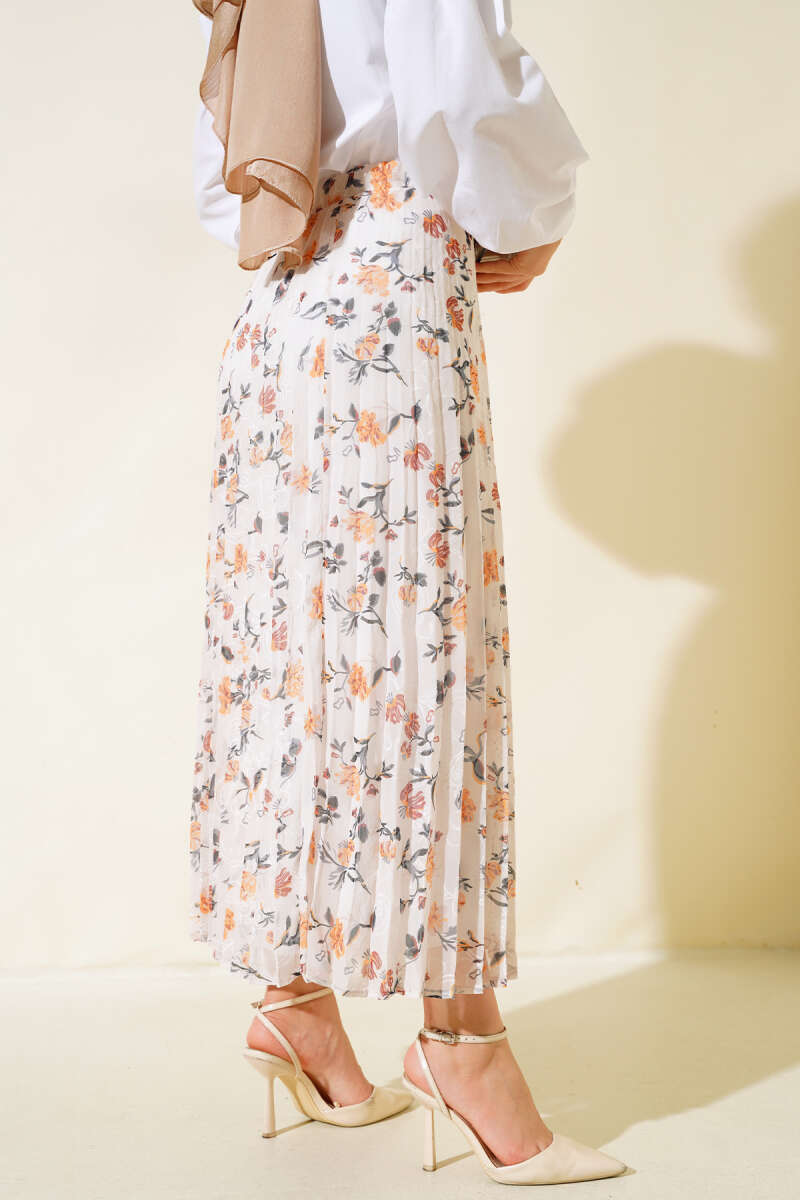 Çiçek Desenli Piliseli Şifon Etek Kahve