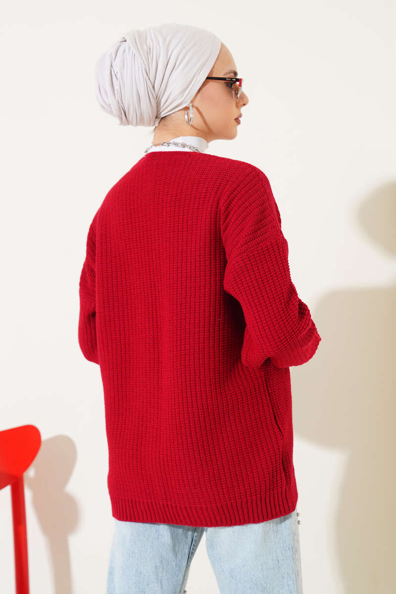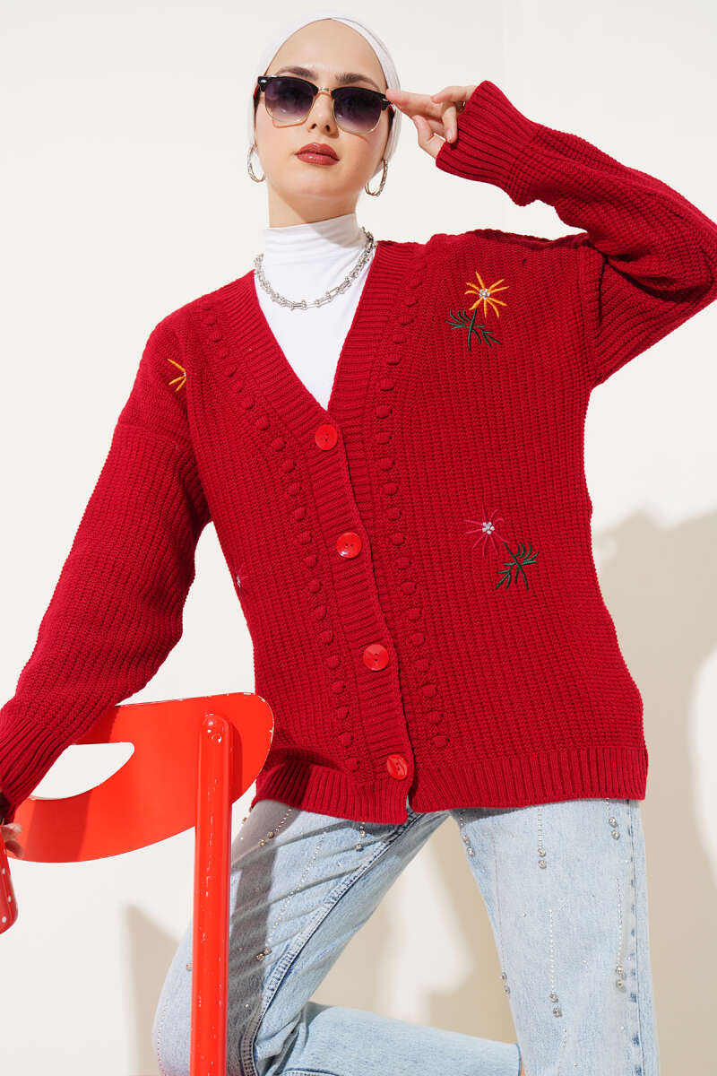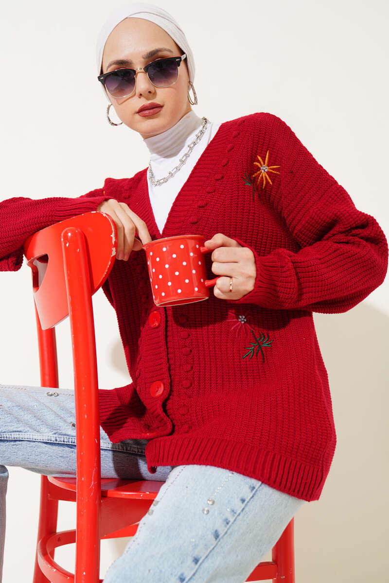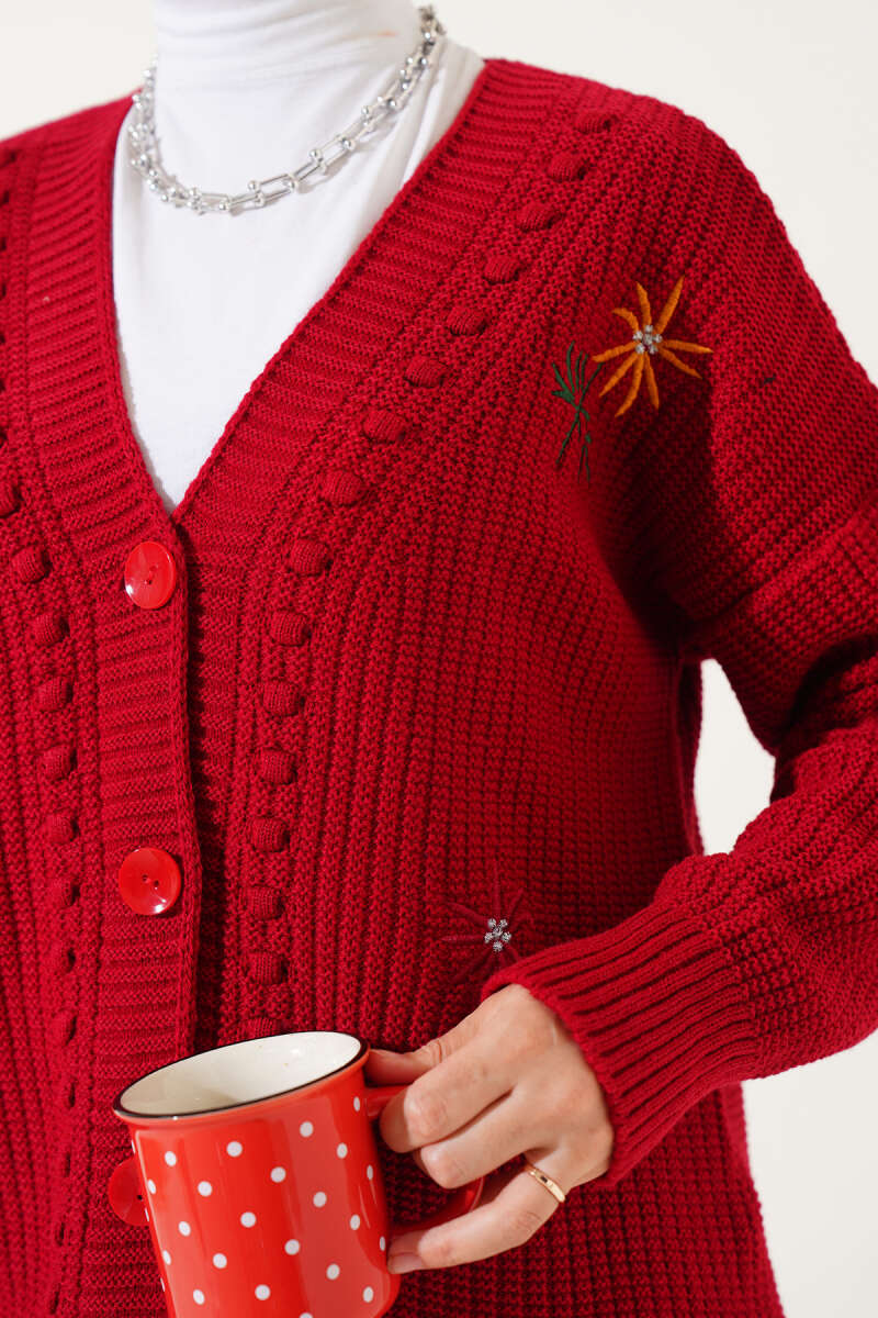 Nakış İşlemeli Düğmeli Triko Hırka Bordo