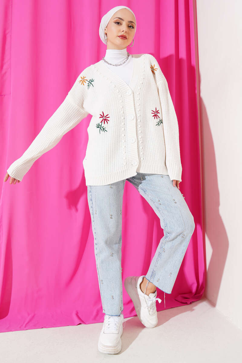 Nakış İşlemeli Düğmeli Triko Hırka Ekru