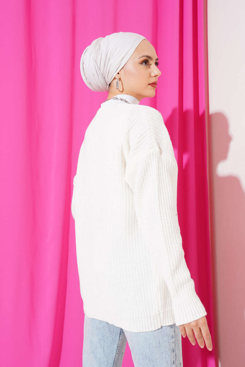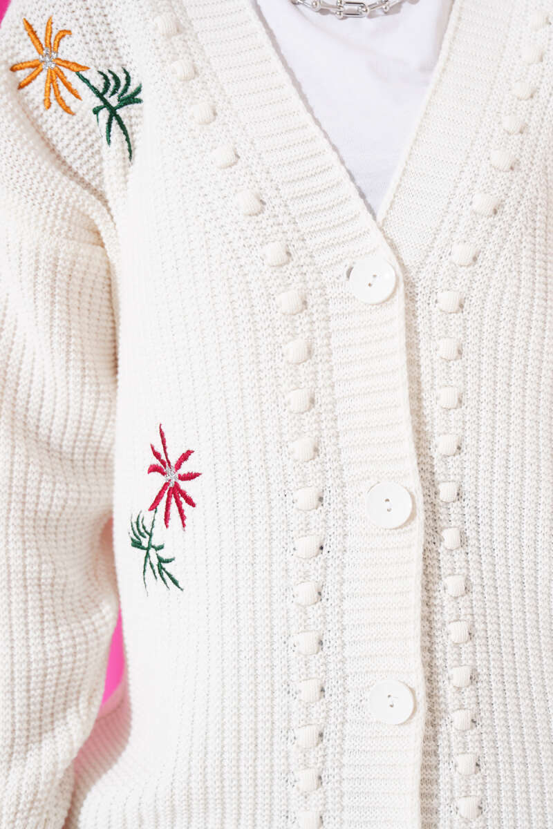 Nakış İşlemeli Düğmeli Triko Hırka Ekru