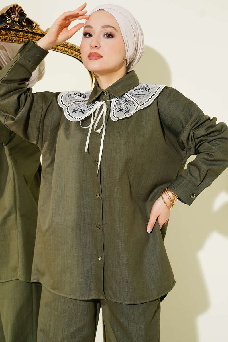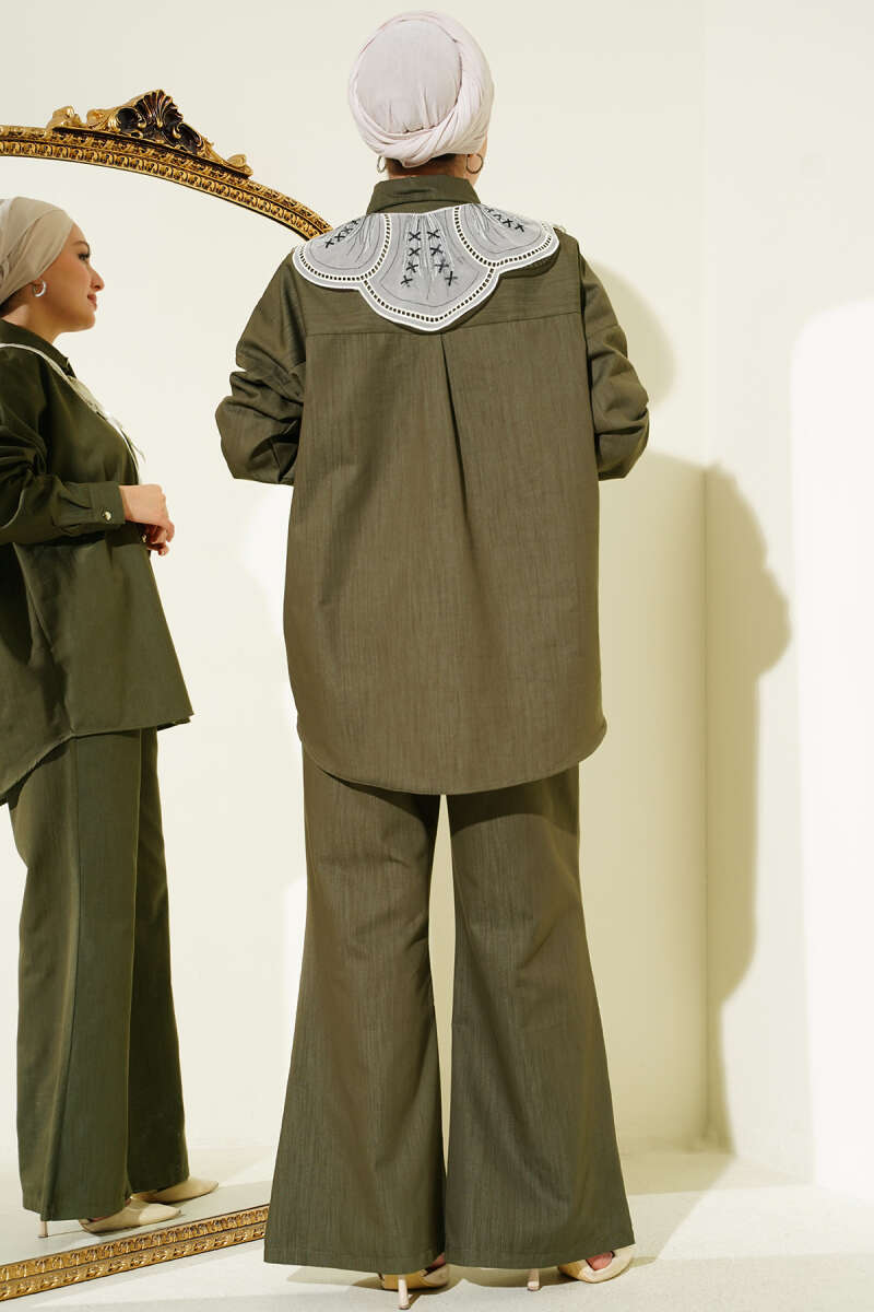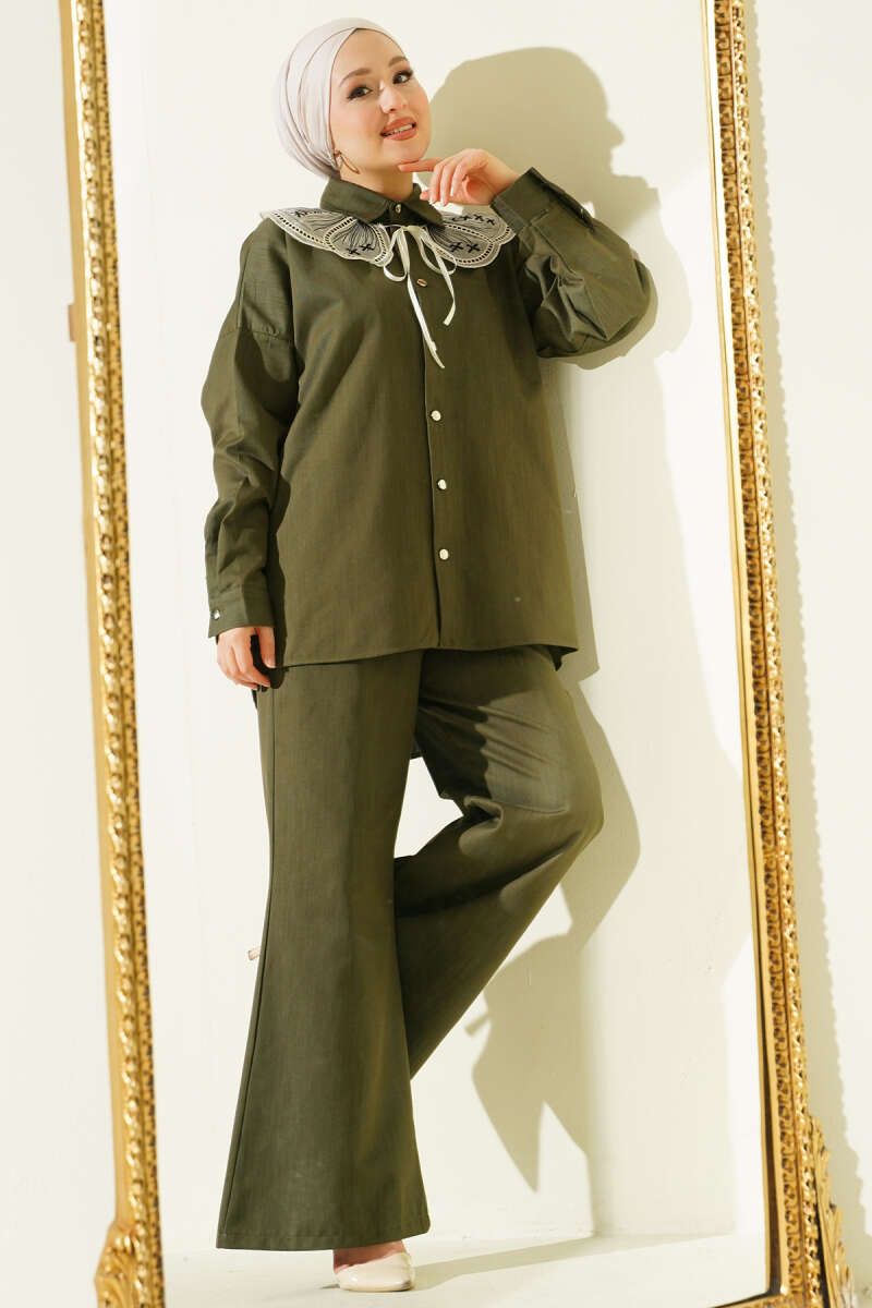 Nakışlı Bebe Yaka Düğmeli İkili Takım Haki