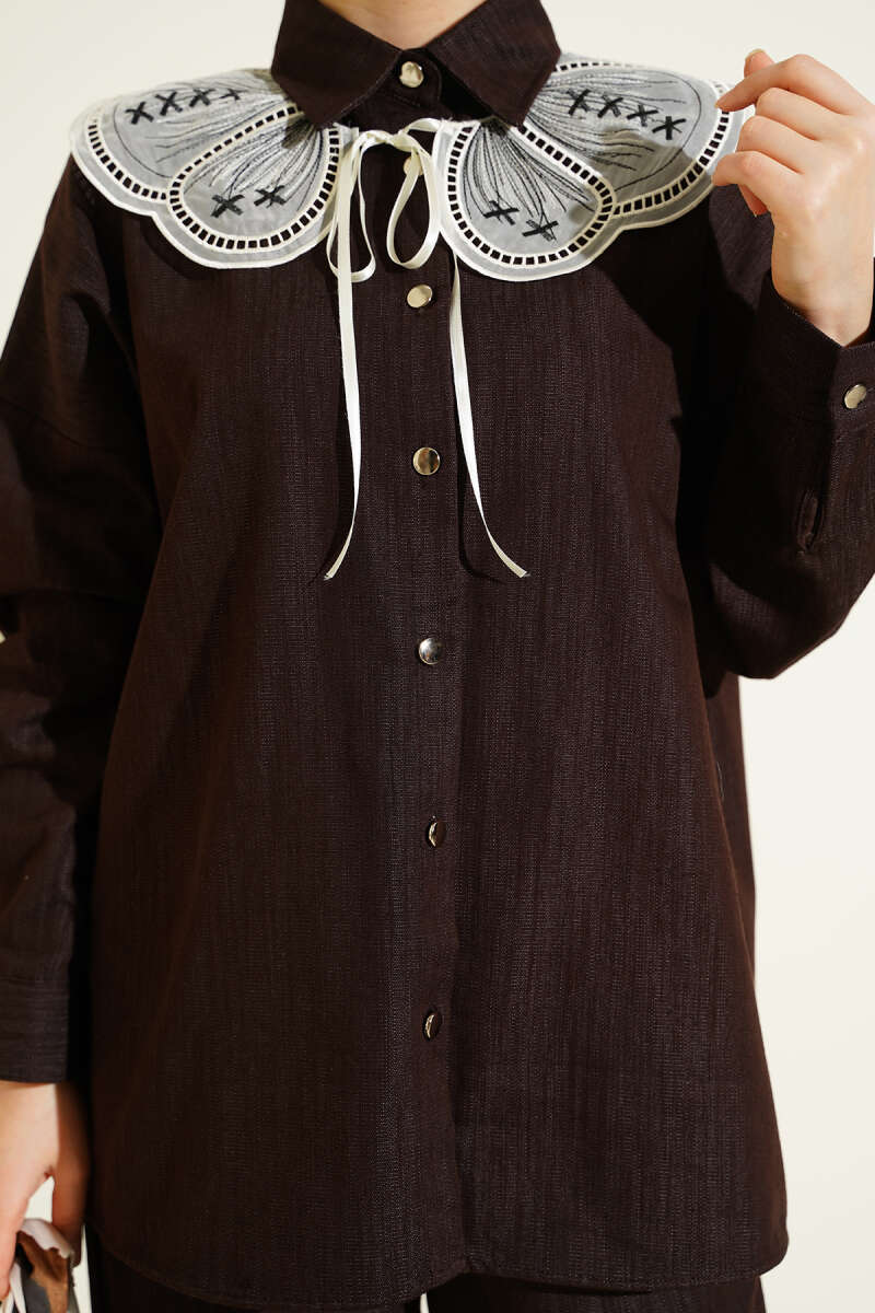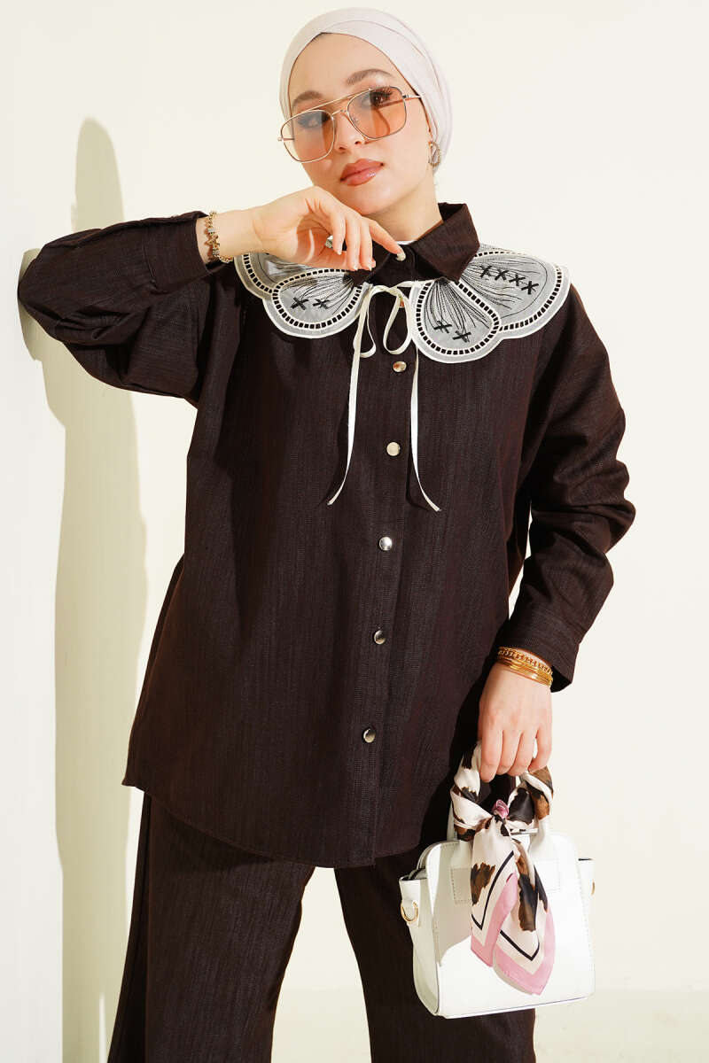 Nakışlı Bebe Yaka Düğmeli İkili Takım Kahve