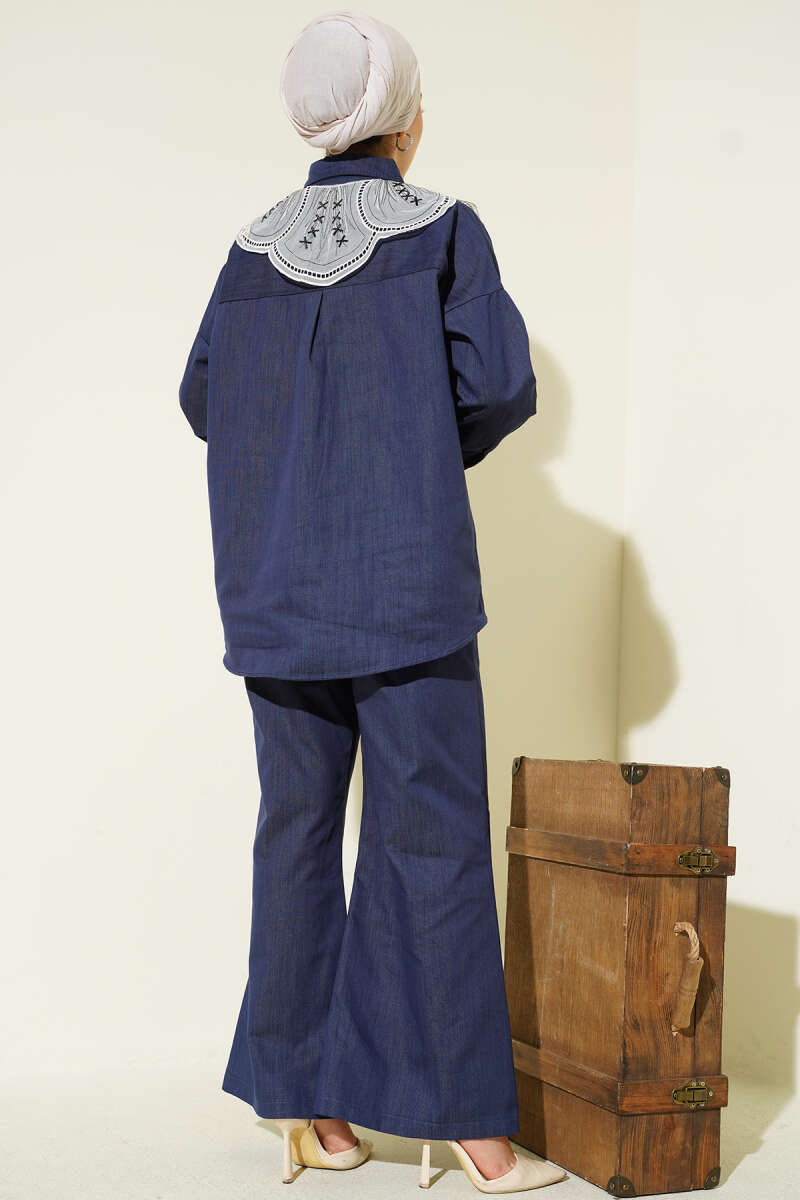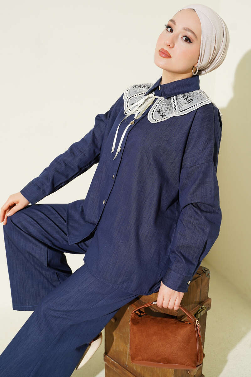 Nakışlı Bebe Yaka Düğmeli İkili Takım Mavi