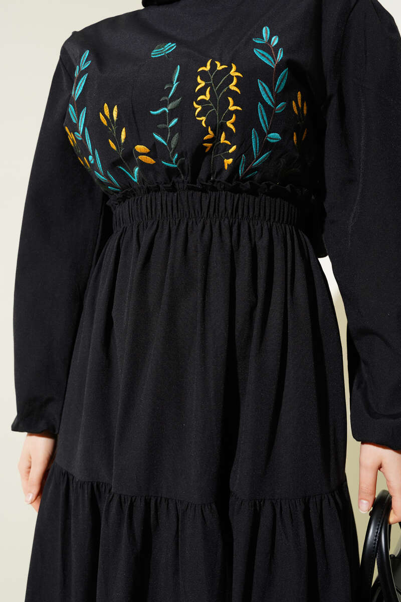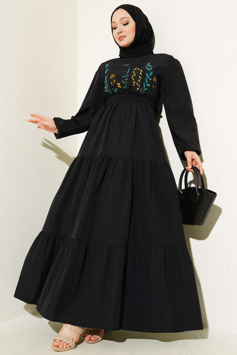 Nakışlı Bel Lastikli Kat Kat Elbise Fuşya