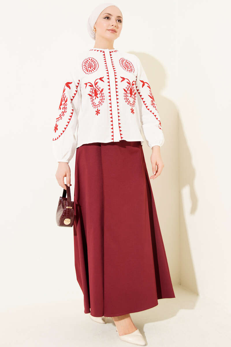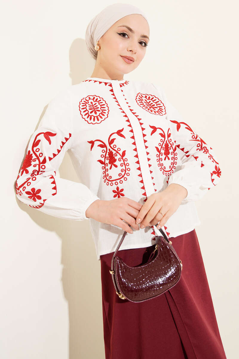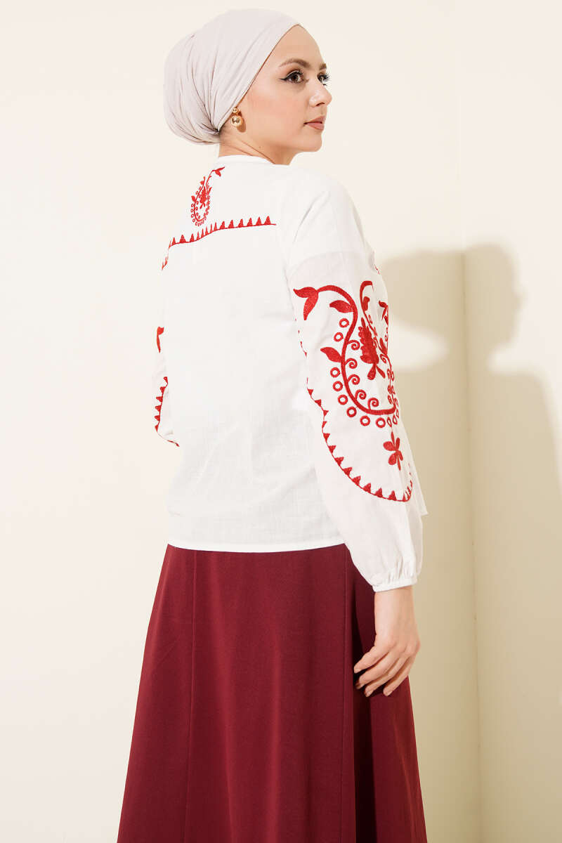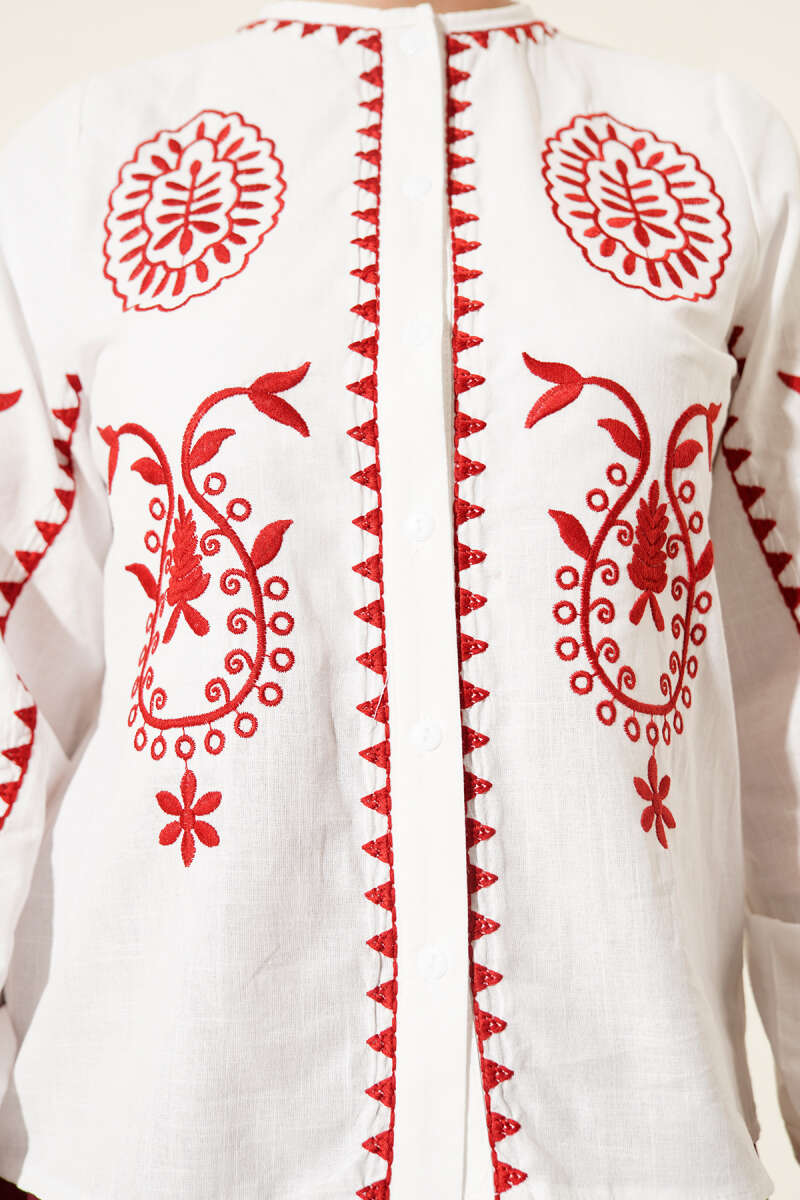 Nakışlı Düğmeli Keten Gömlek Ekru