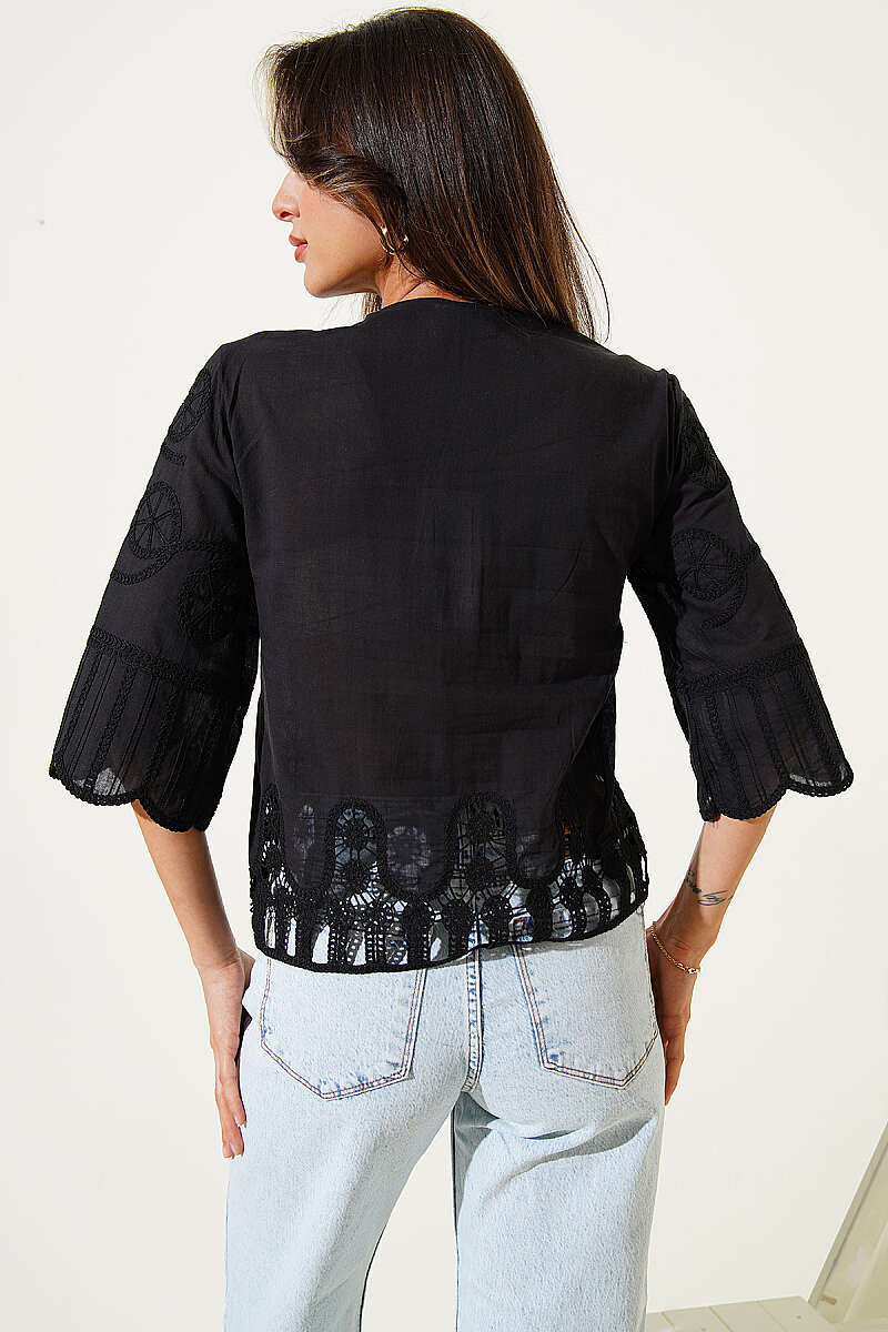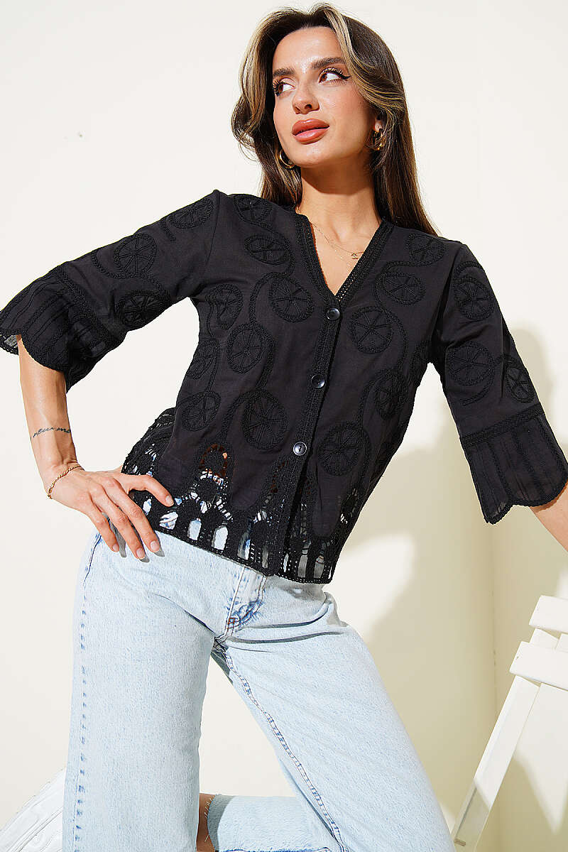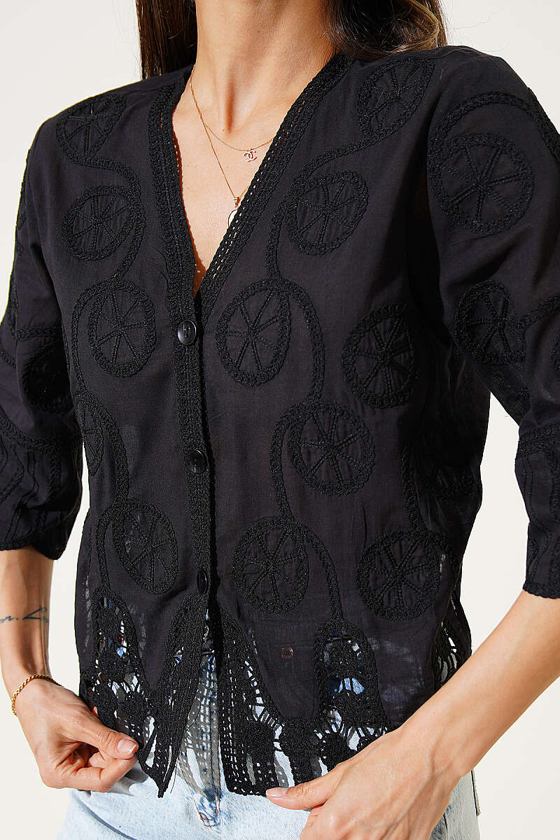Nakışlı Düğmeli Yarım Kol Gömlek Siyah