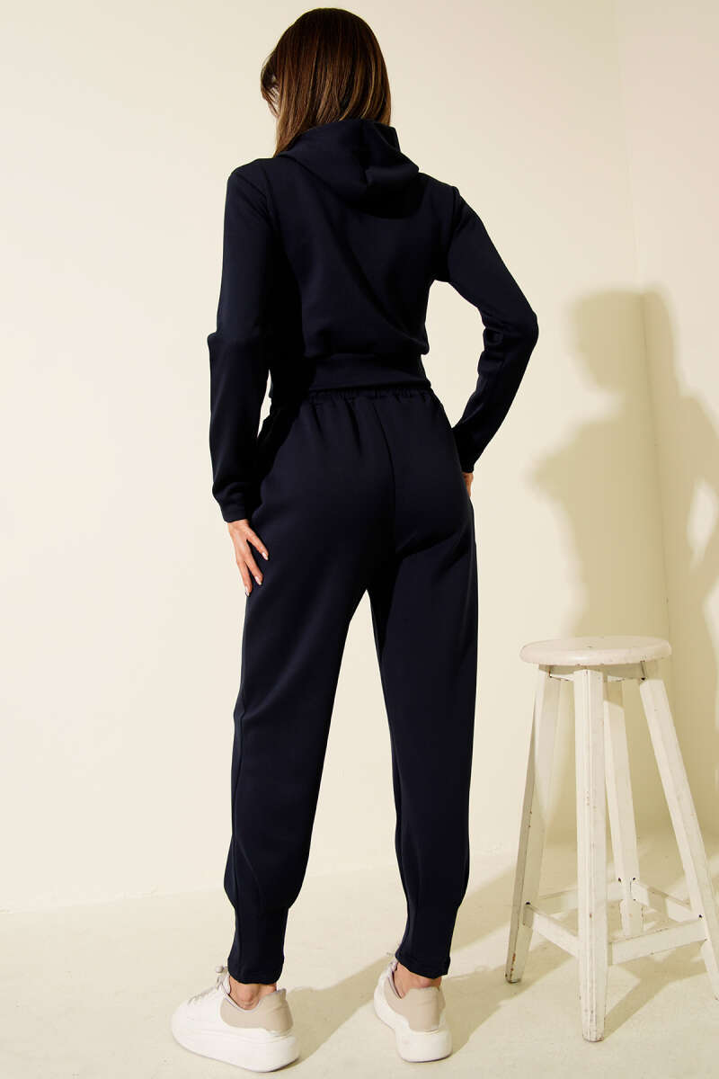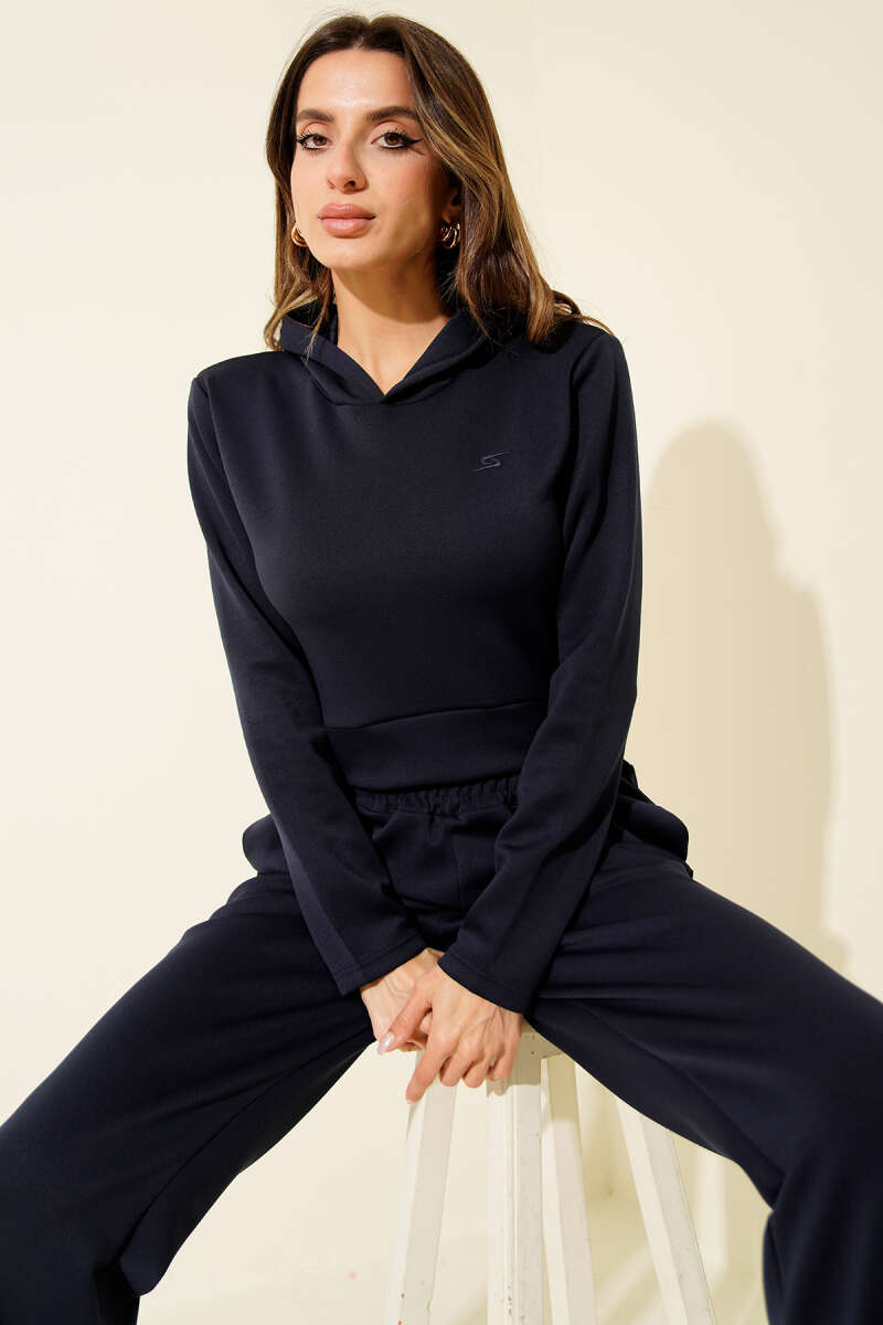 Nakışlı Kapüşonlu Crop İkili Takım Lacivert