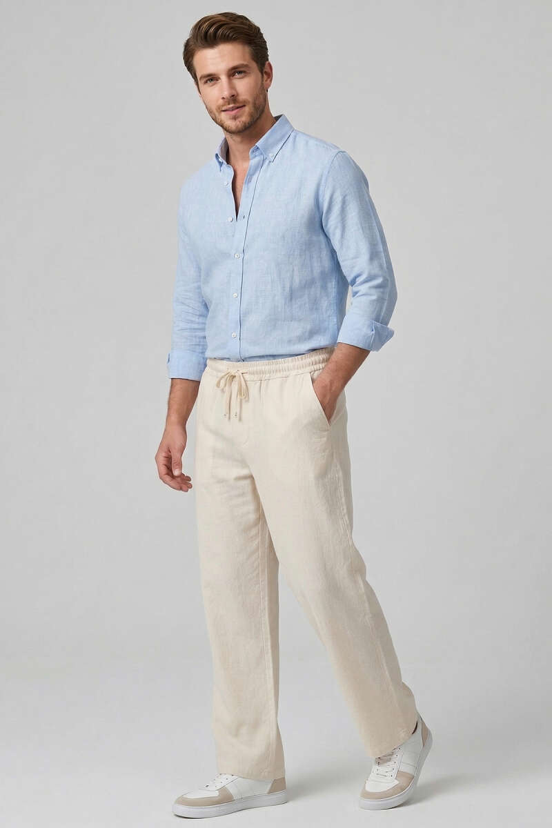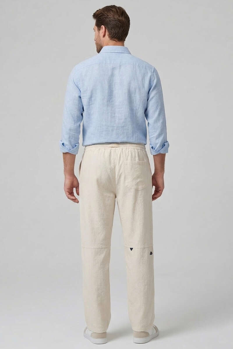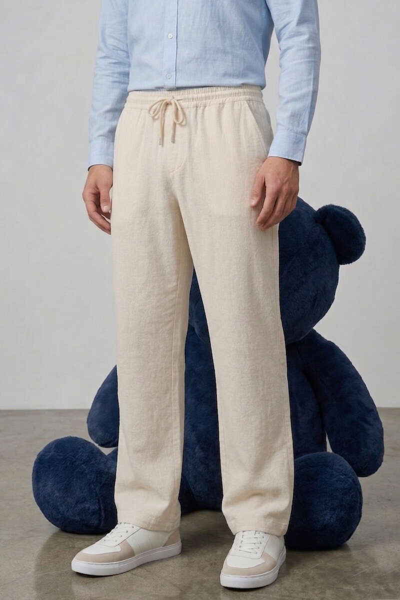 Nakışlı Keten Erkek Pantolon Bej