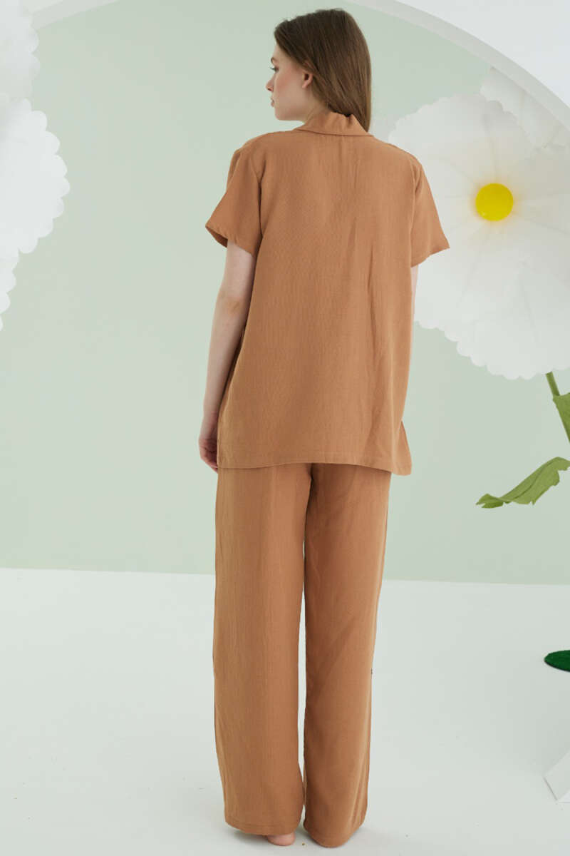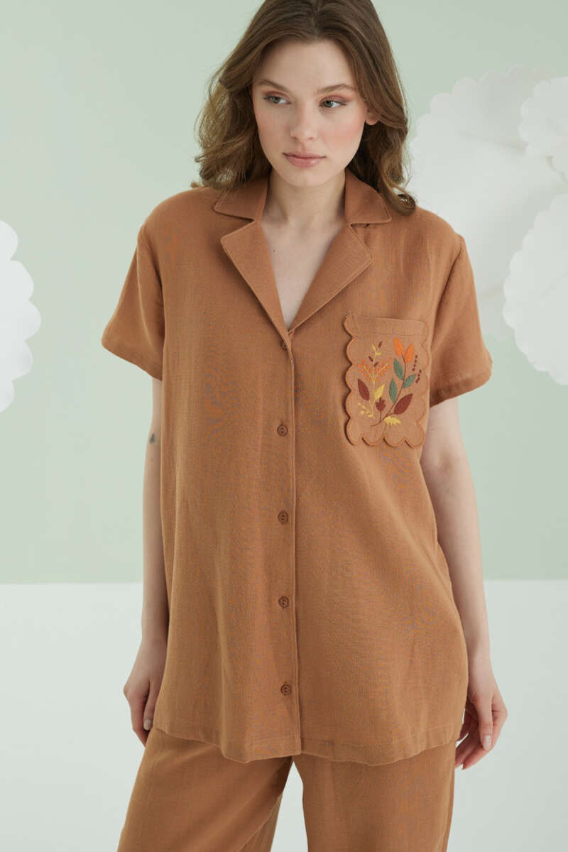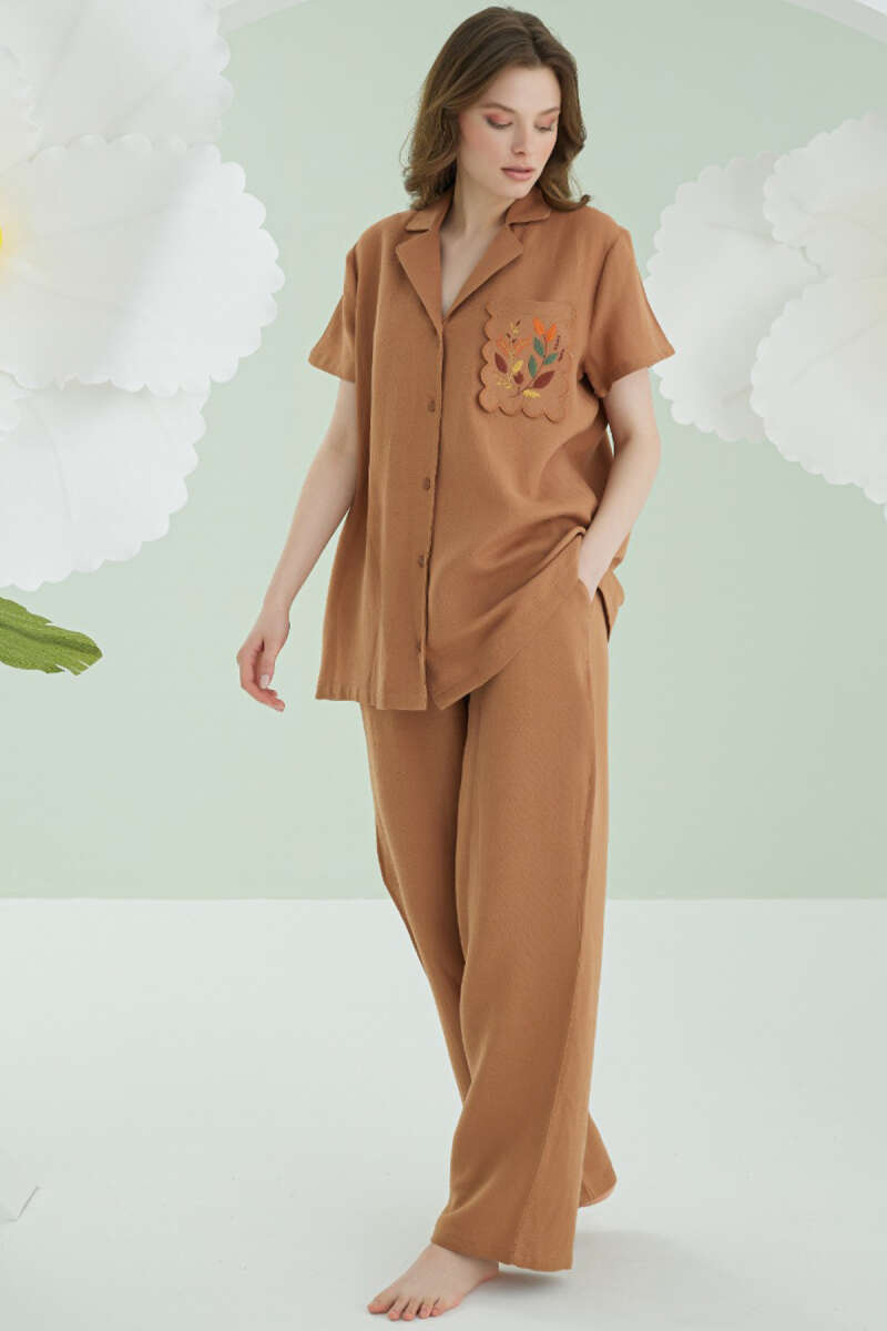 NBB Cep Nakışlı Kısa Kol Müslin Pijama Takım Kahverengi