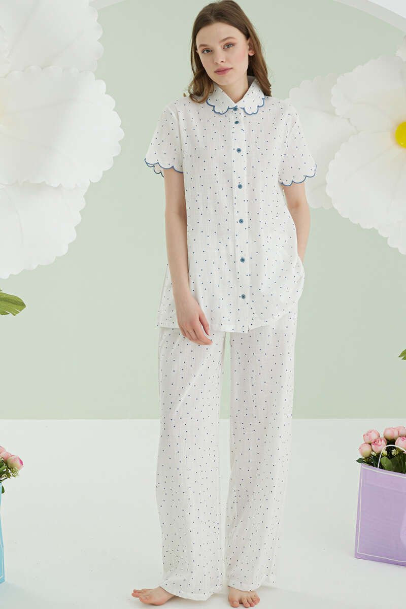 NBB Puantiyeli Keten Pijama Takımı Mavi